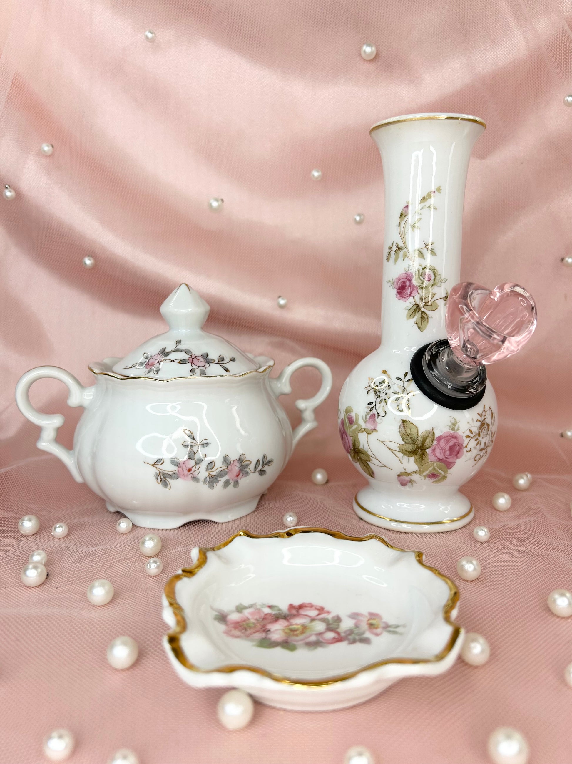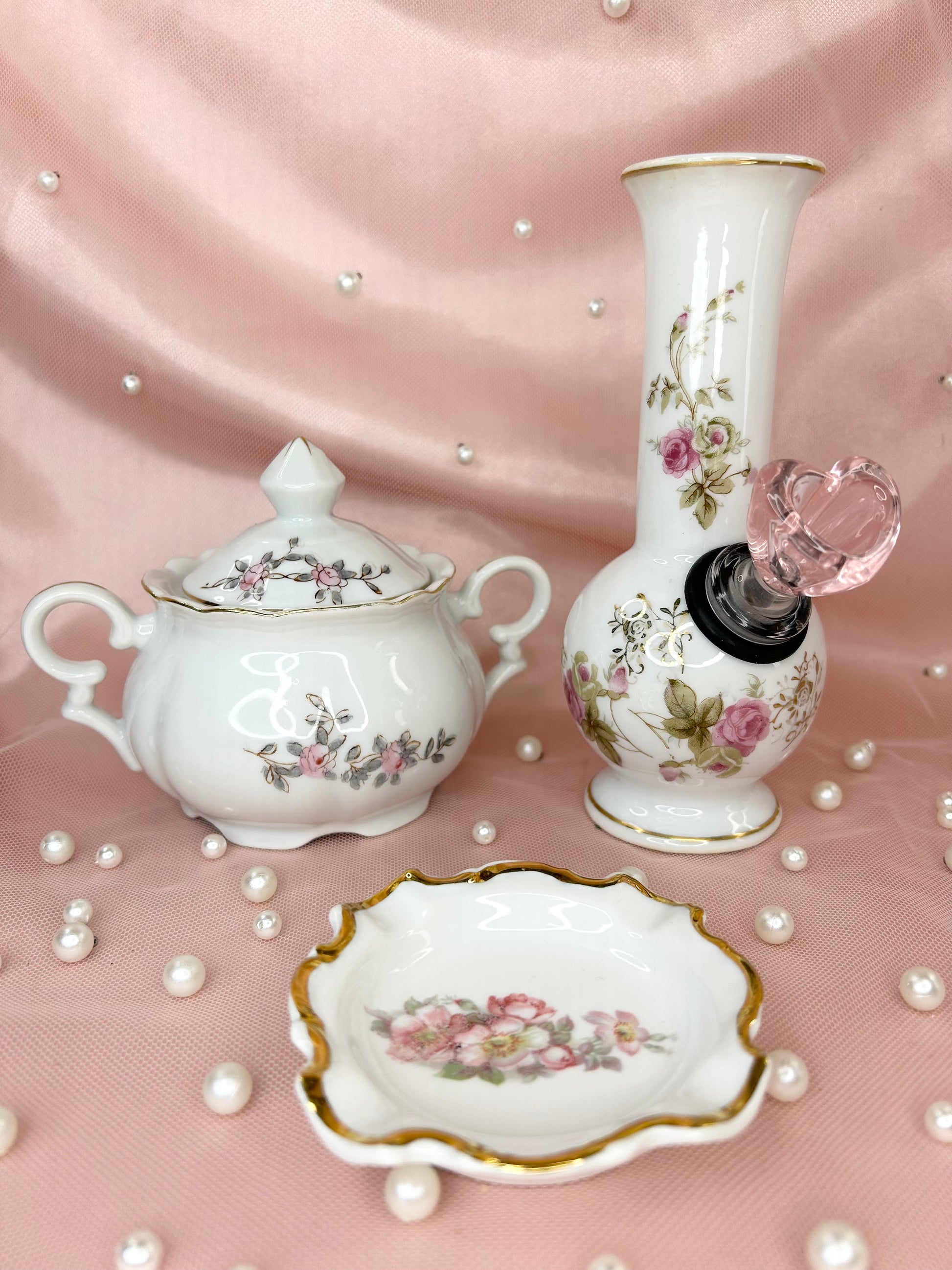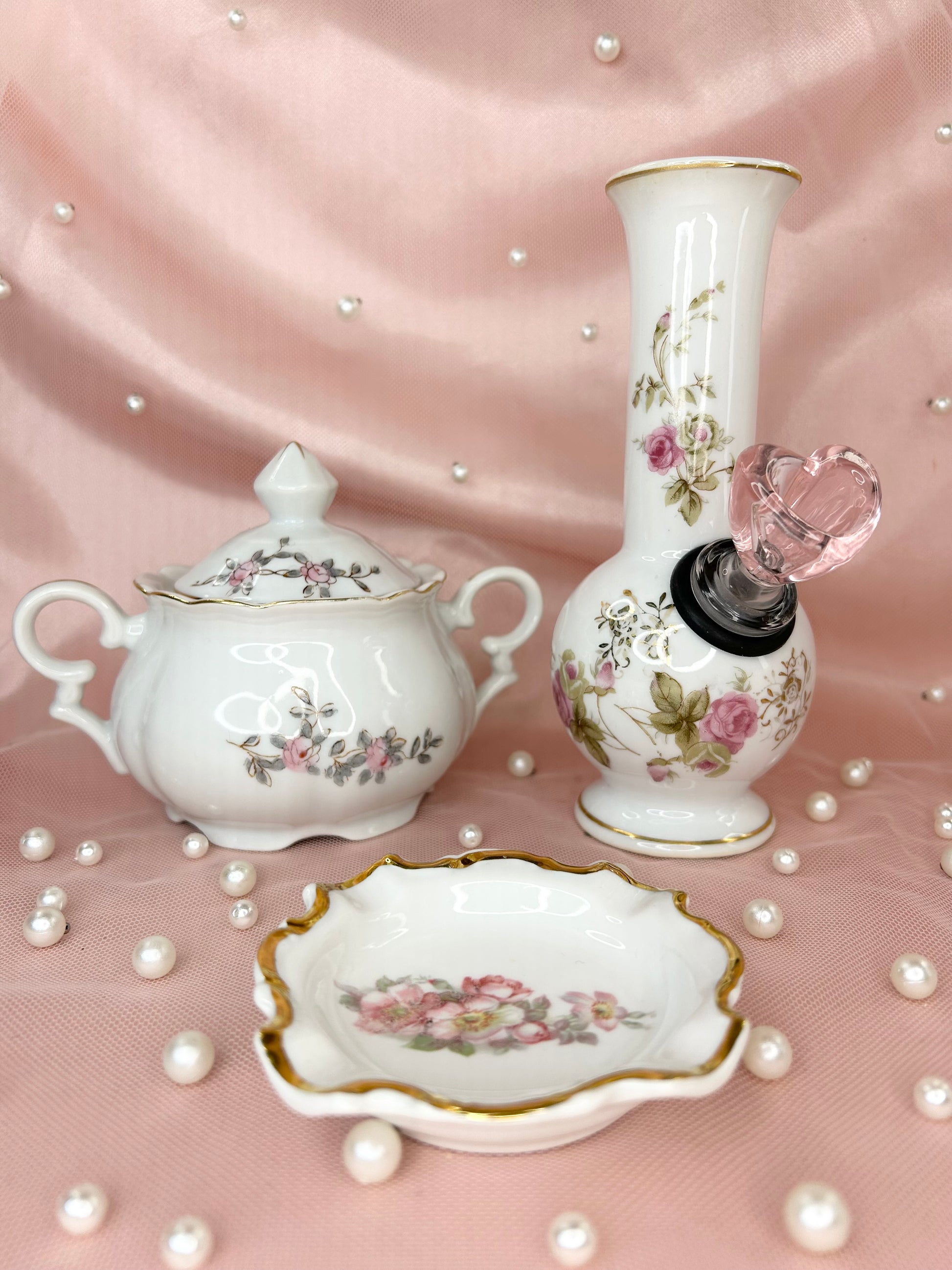- Includes 14mm pink heart glass bowl piece, bubbler, ashtray and matching box