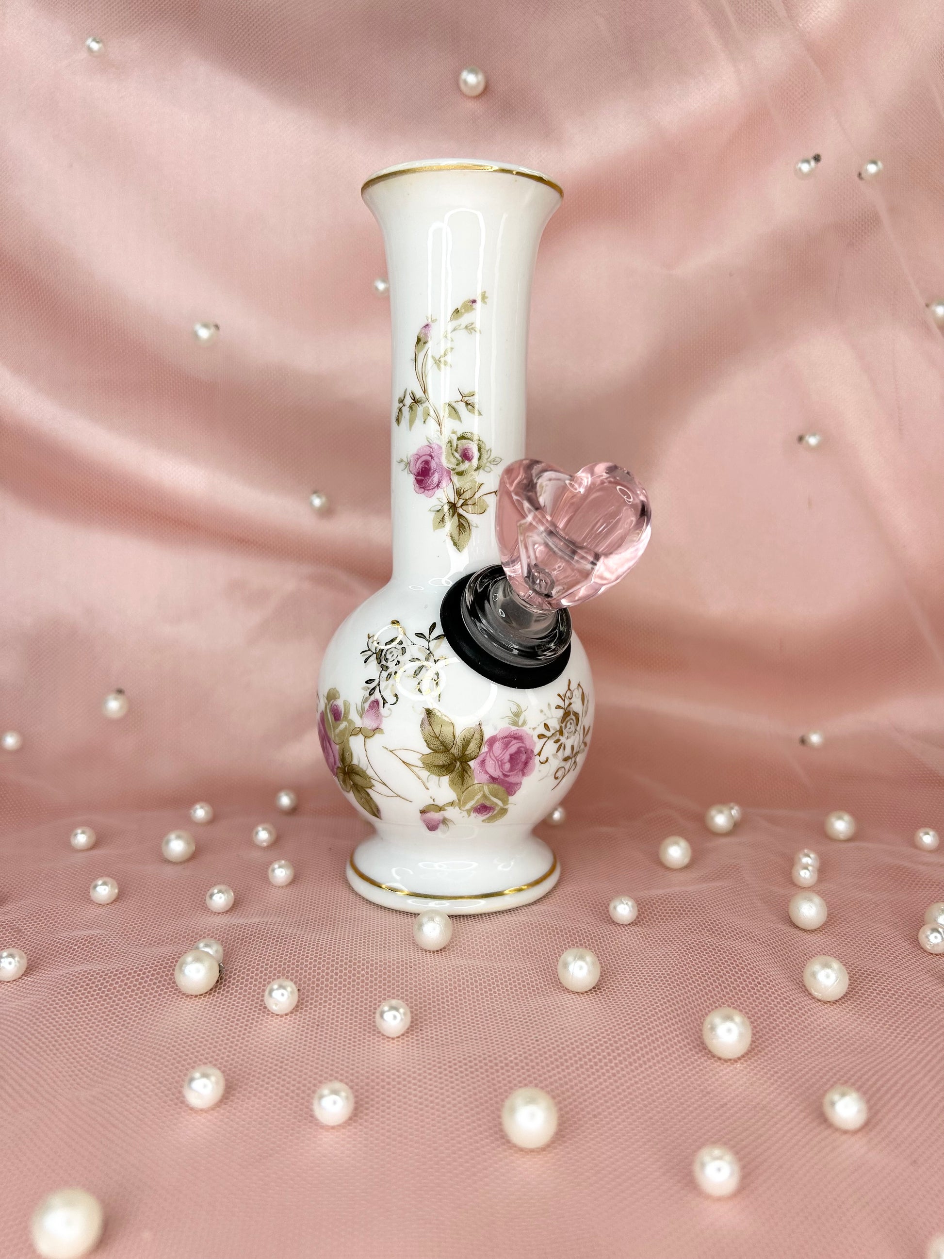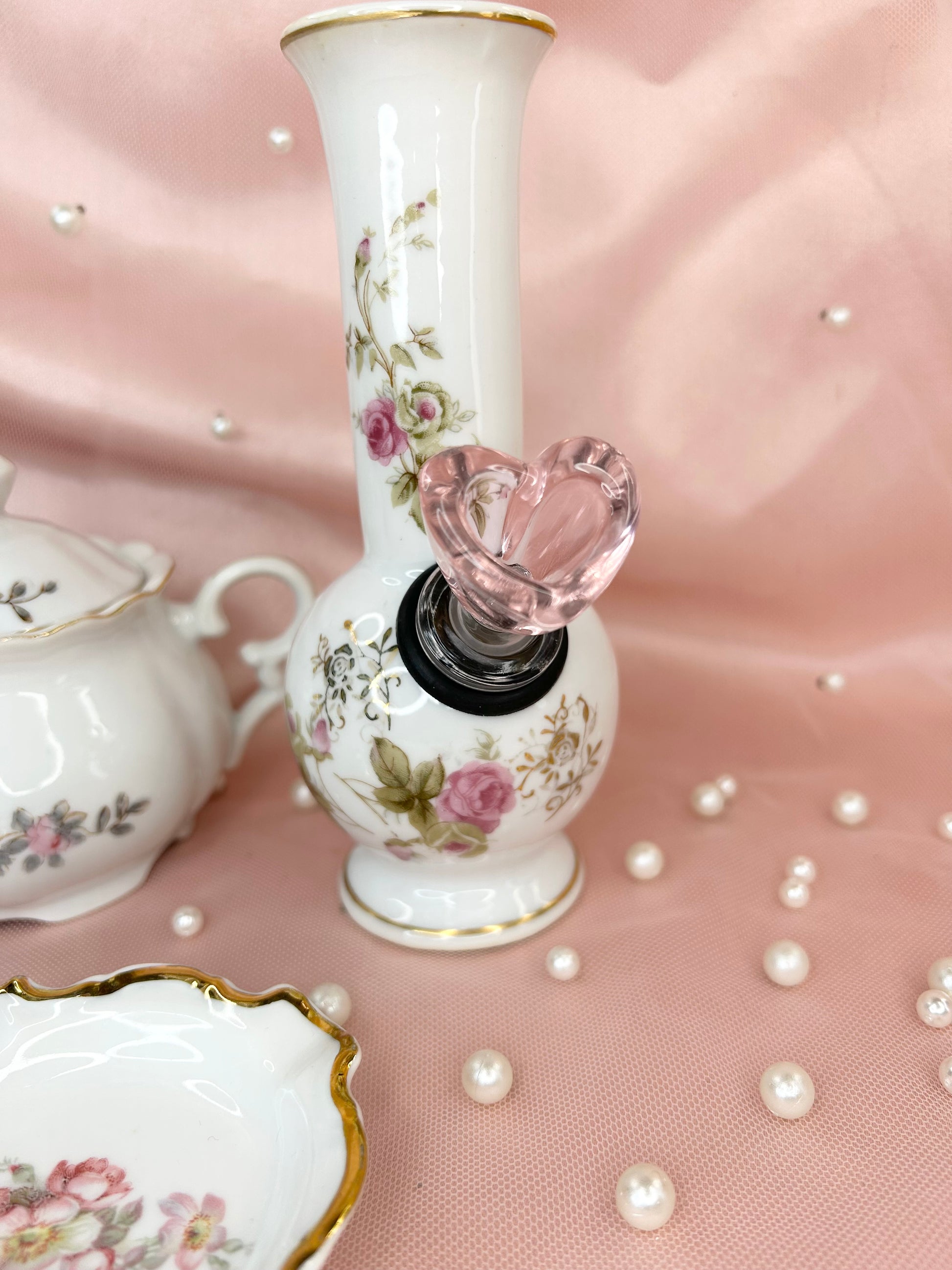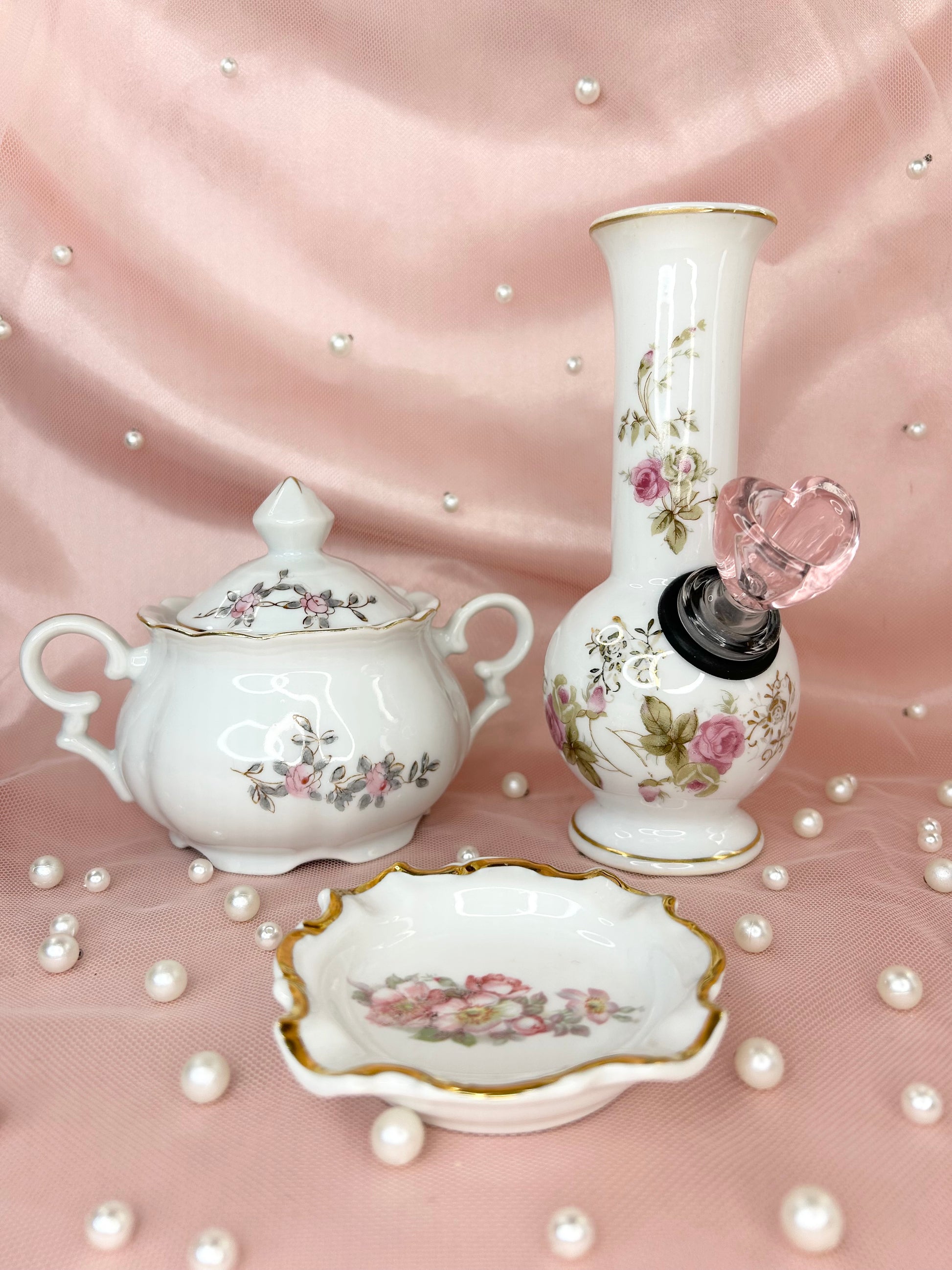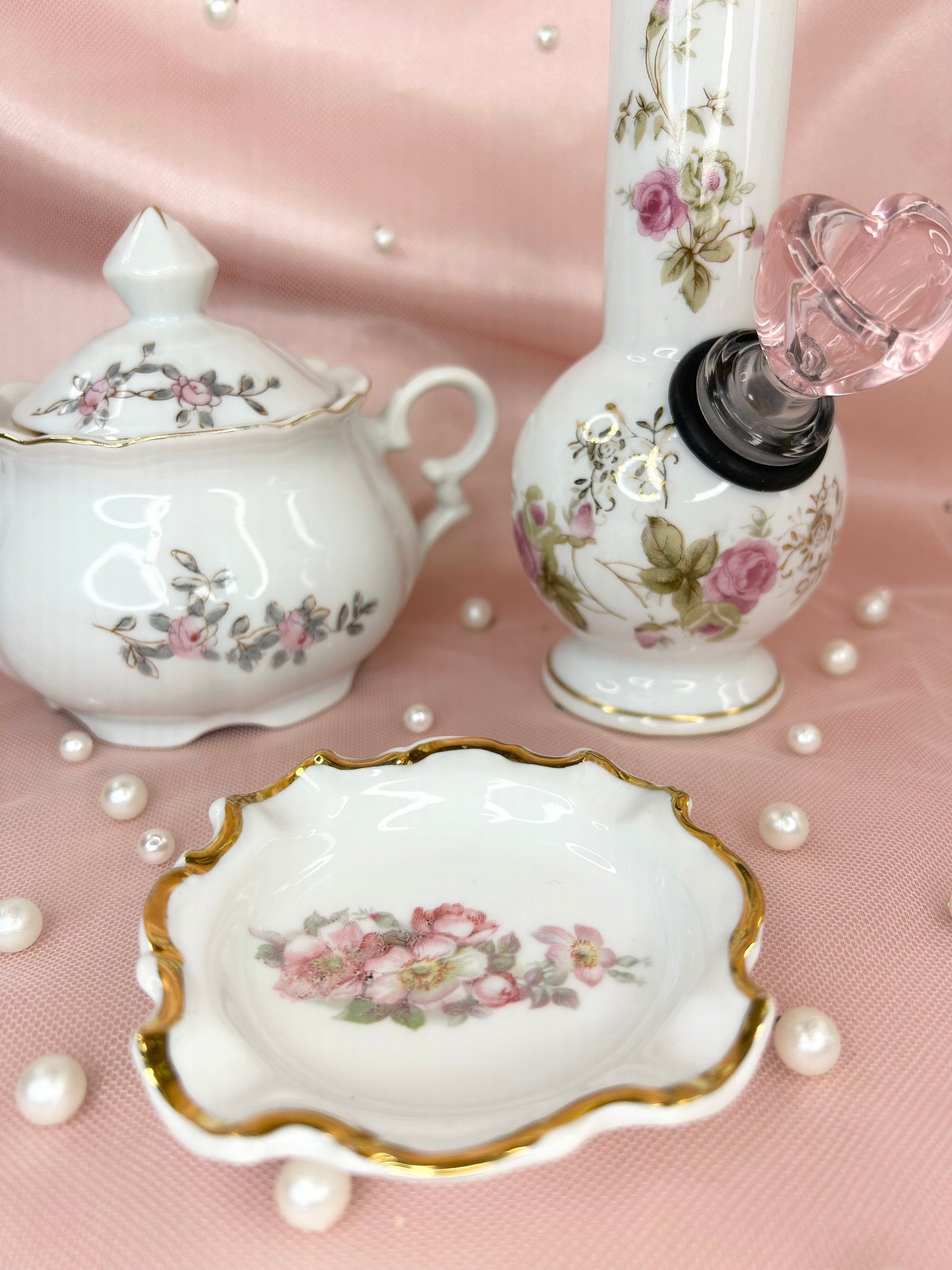 - Includes 14mm pink heart glass bowl piece, bubbler, ashtray and matching box