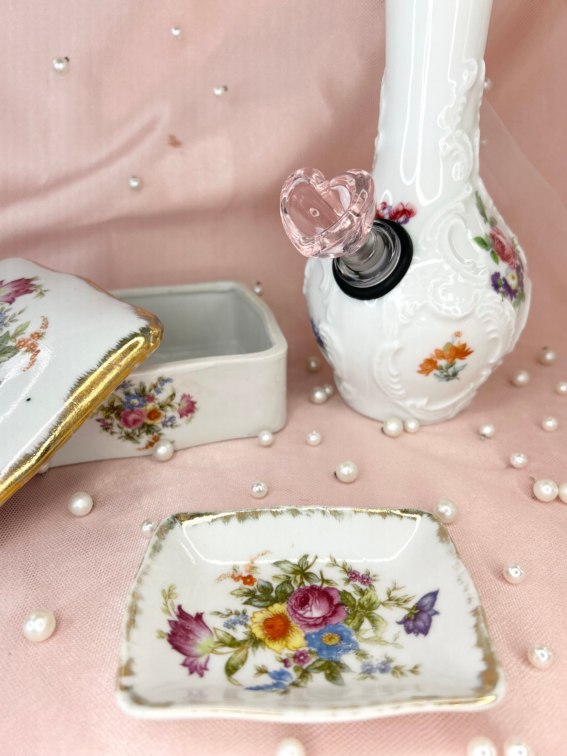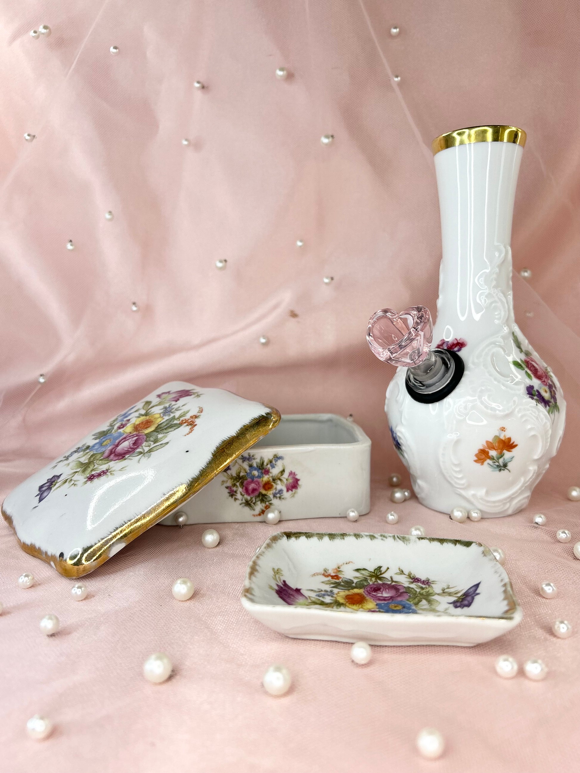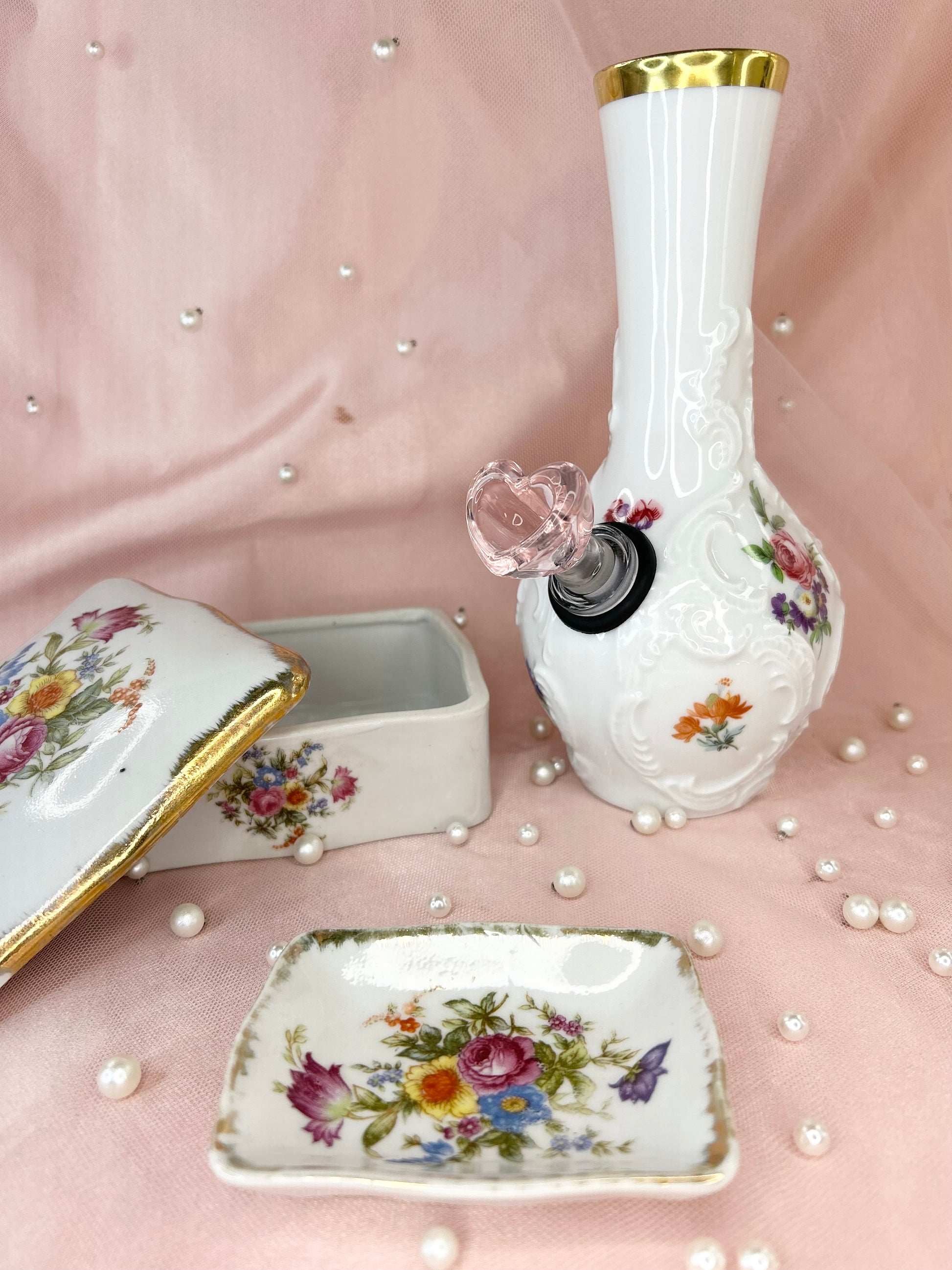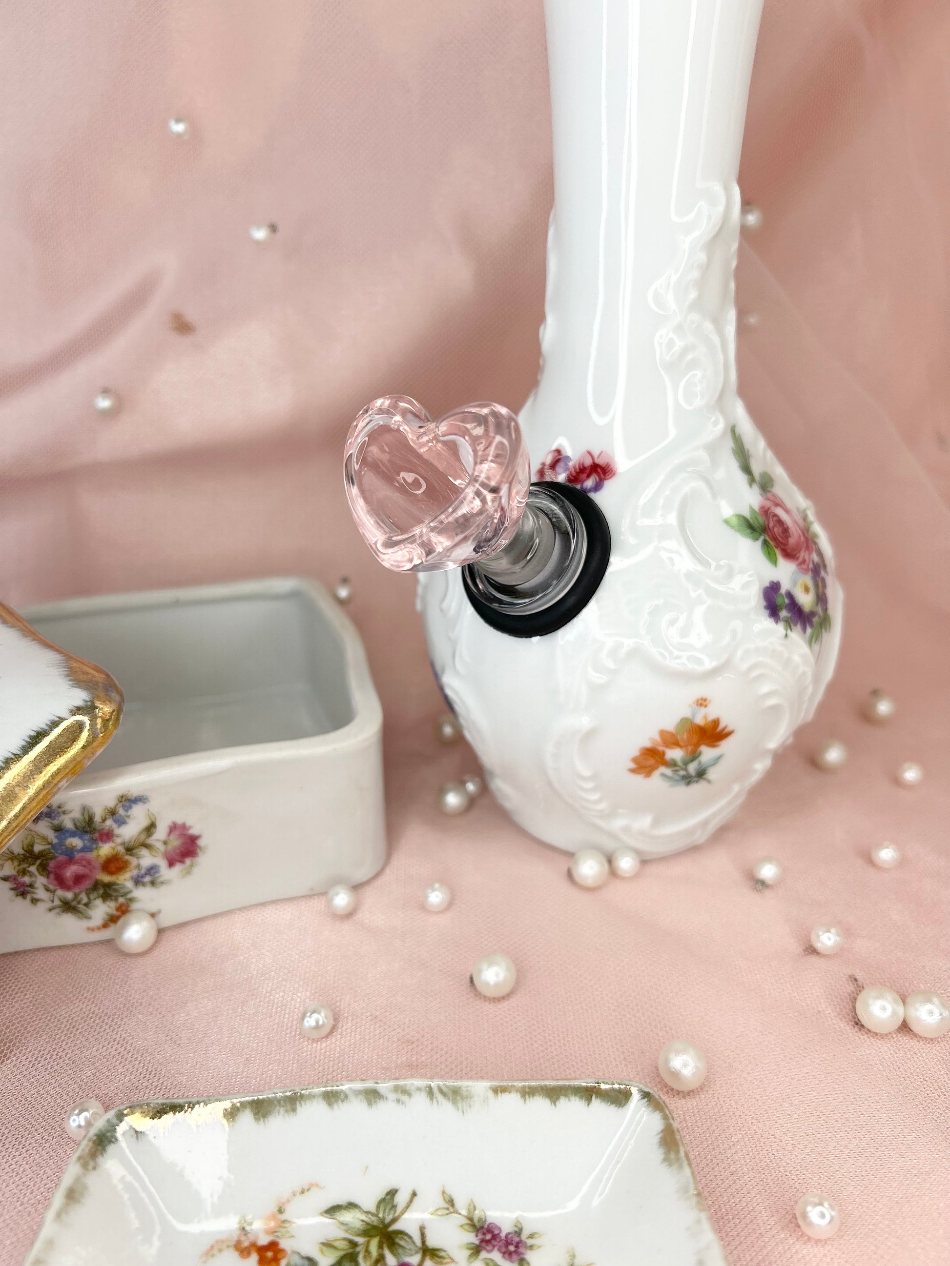 - Includes 14mm pink glass heart bowl piece, bong, ashtray and matching box