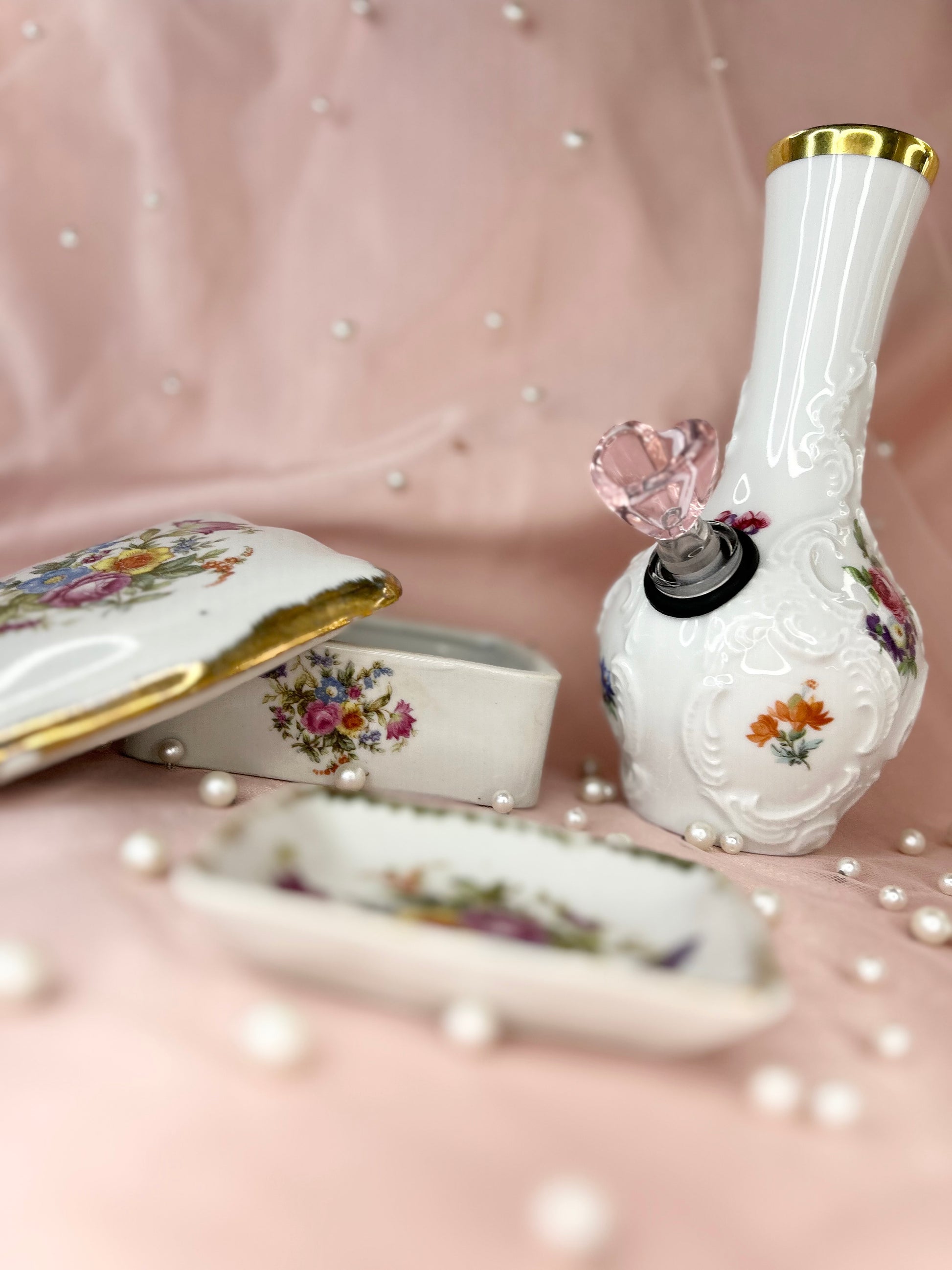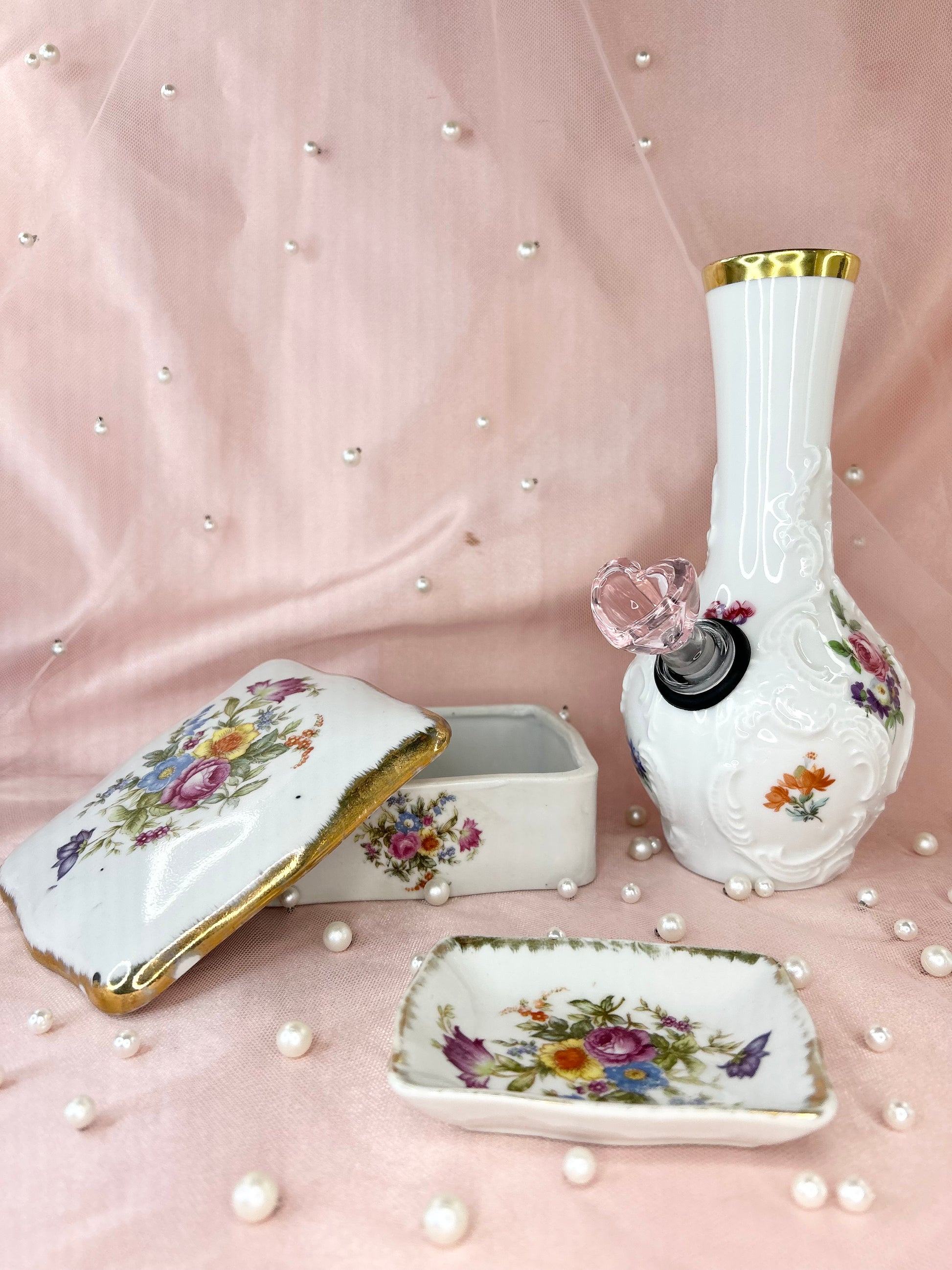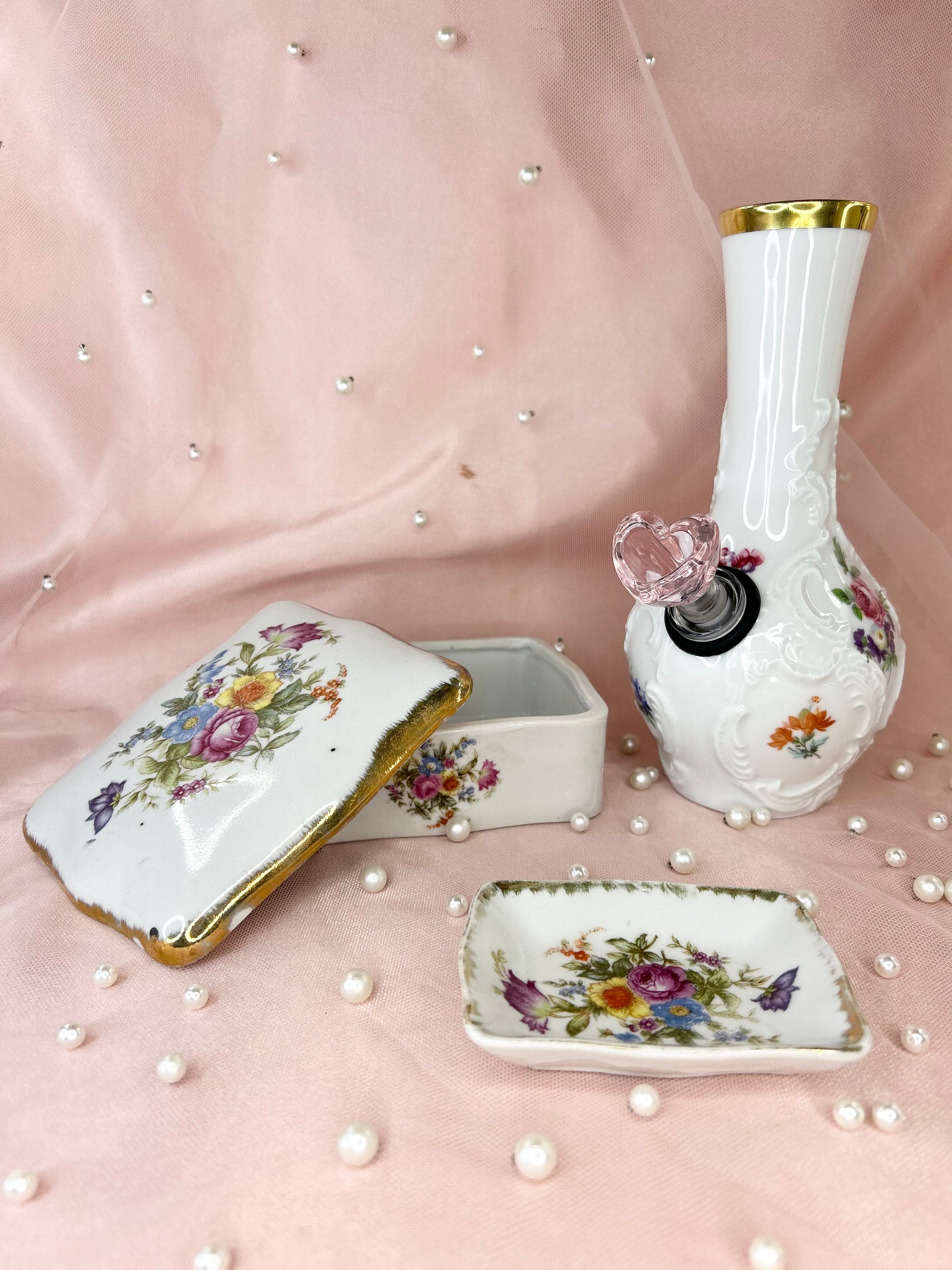 - Includes 14mm pink glass heart bowl piece, bong, ashtray and matching box