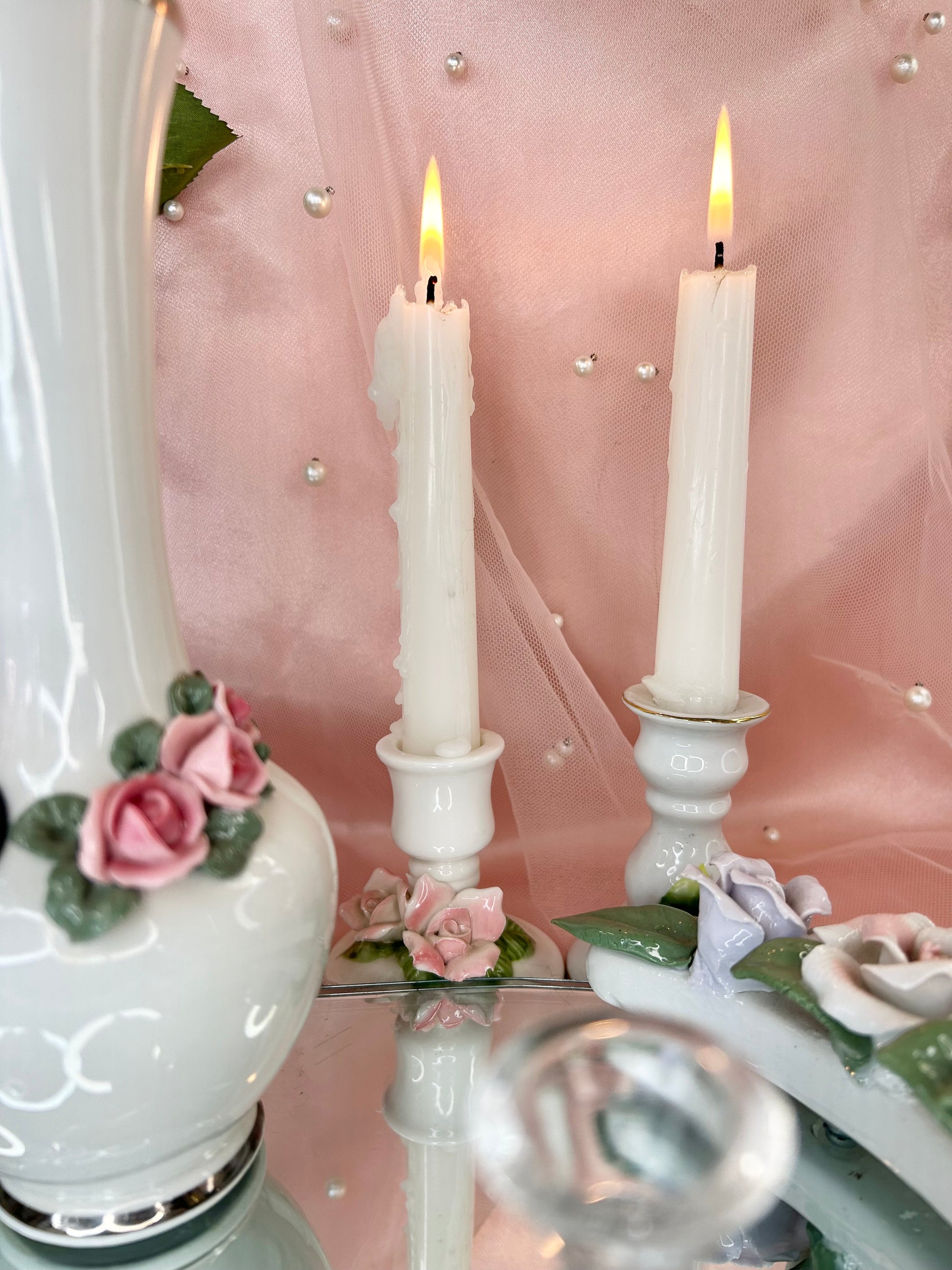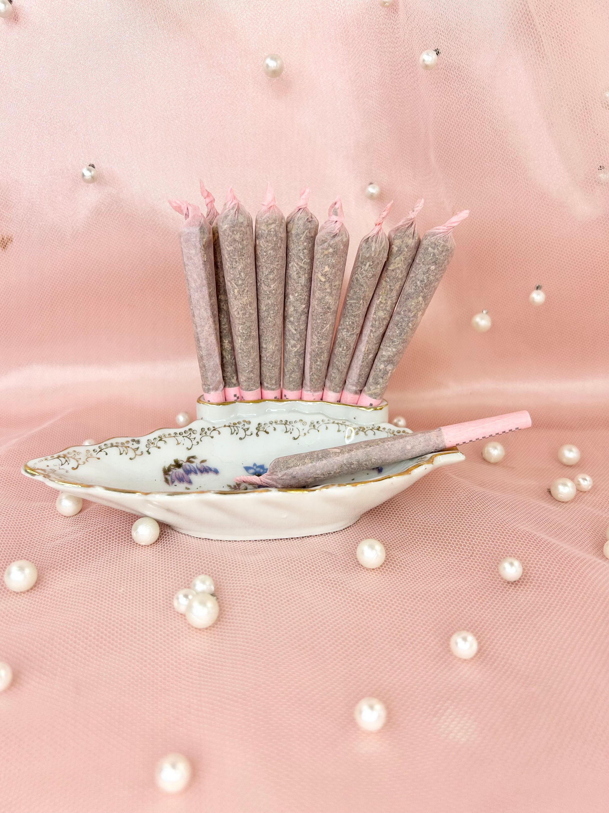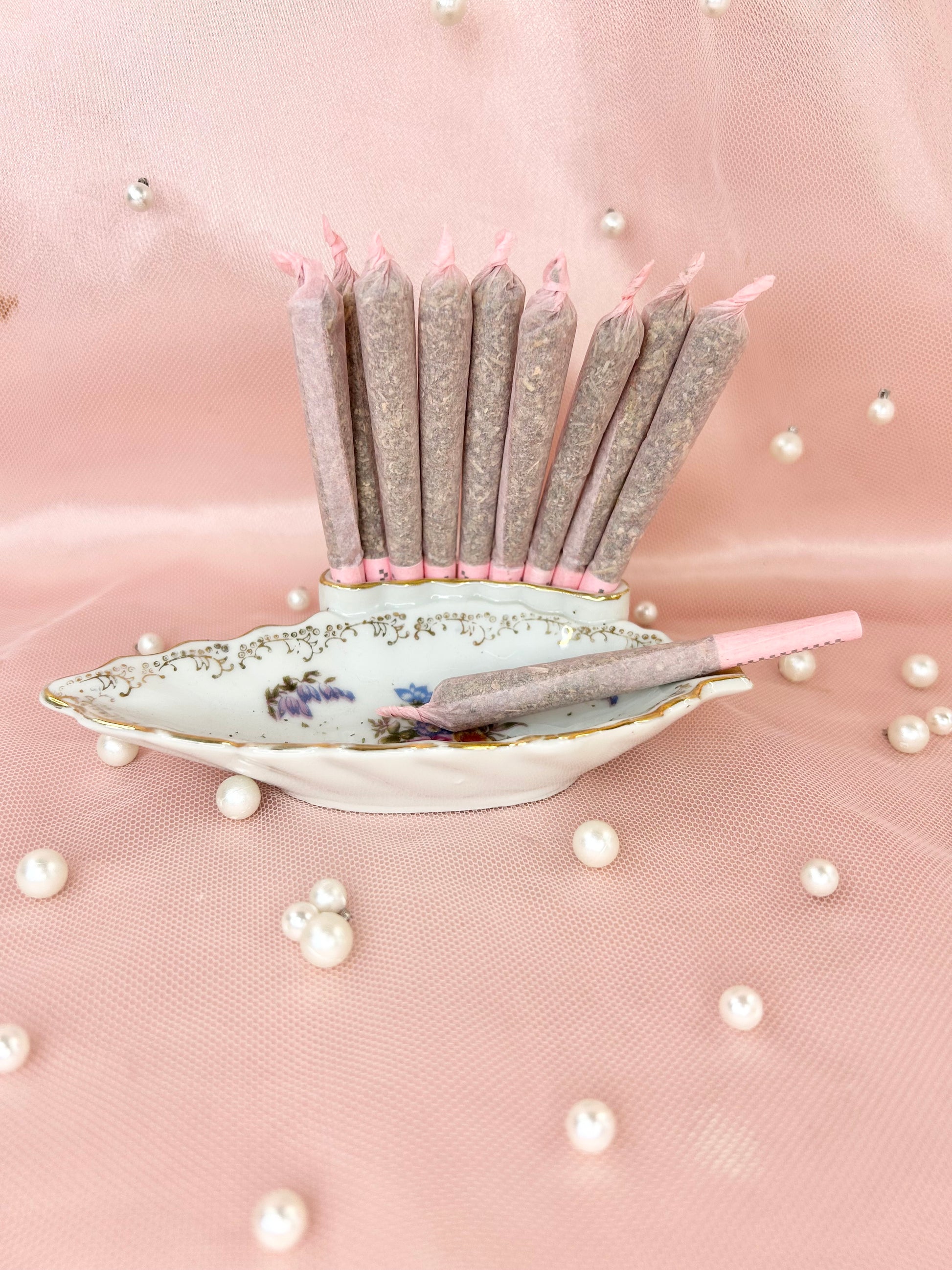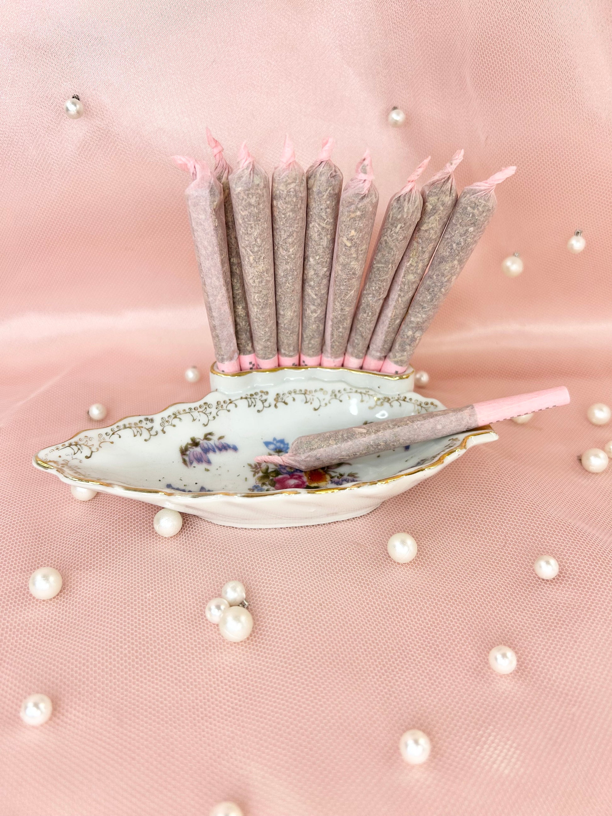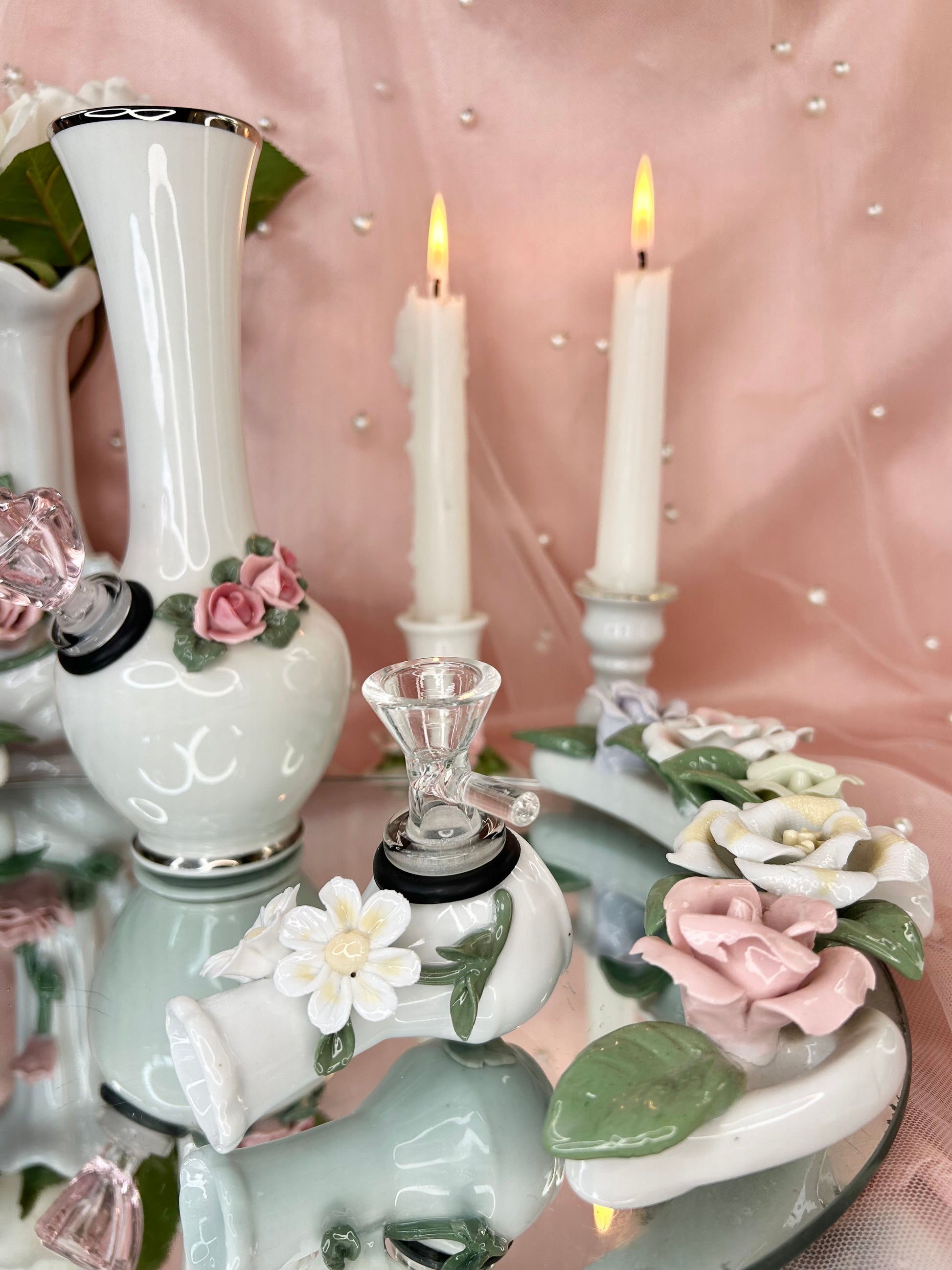 - Party Set includes two pipes, one rose bong, three 14mm bowl pieces, lighters, matches, floral candle holders, candles, matching vase, porcelain leaf joint holder, two ashtrays and floral mirror tray to display it all