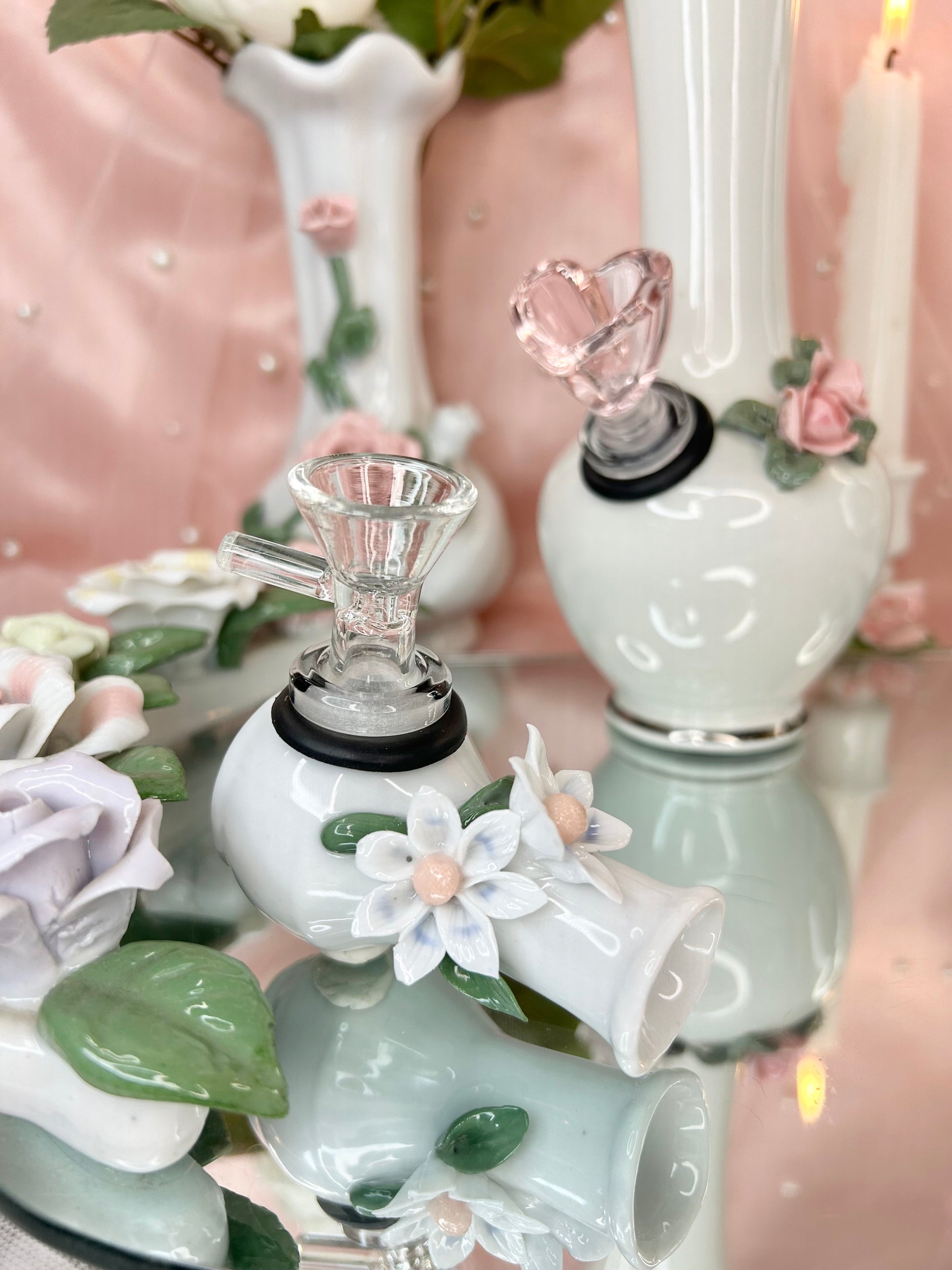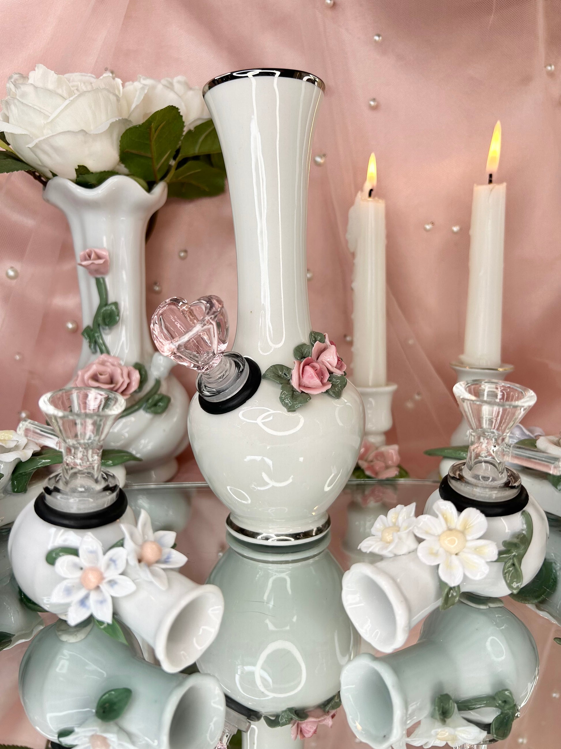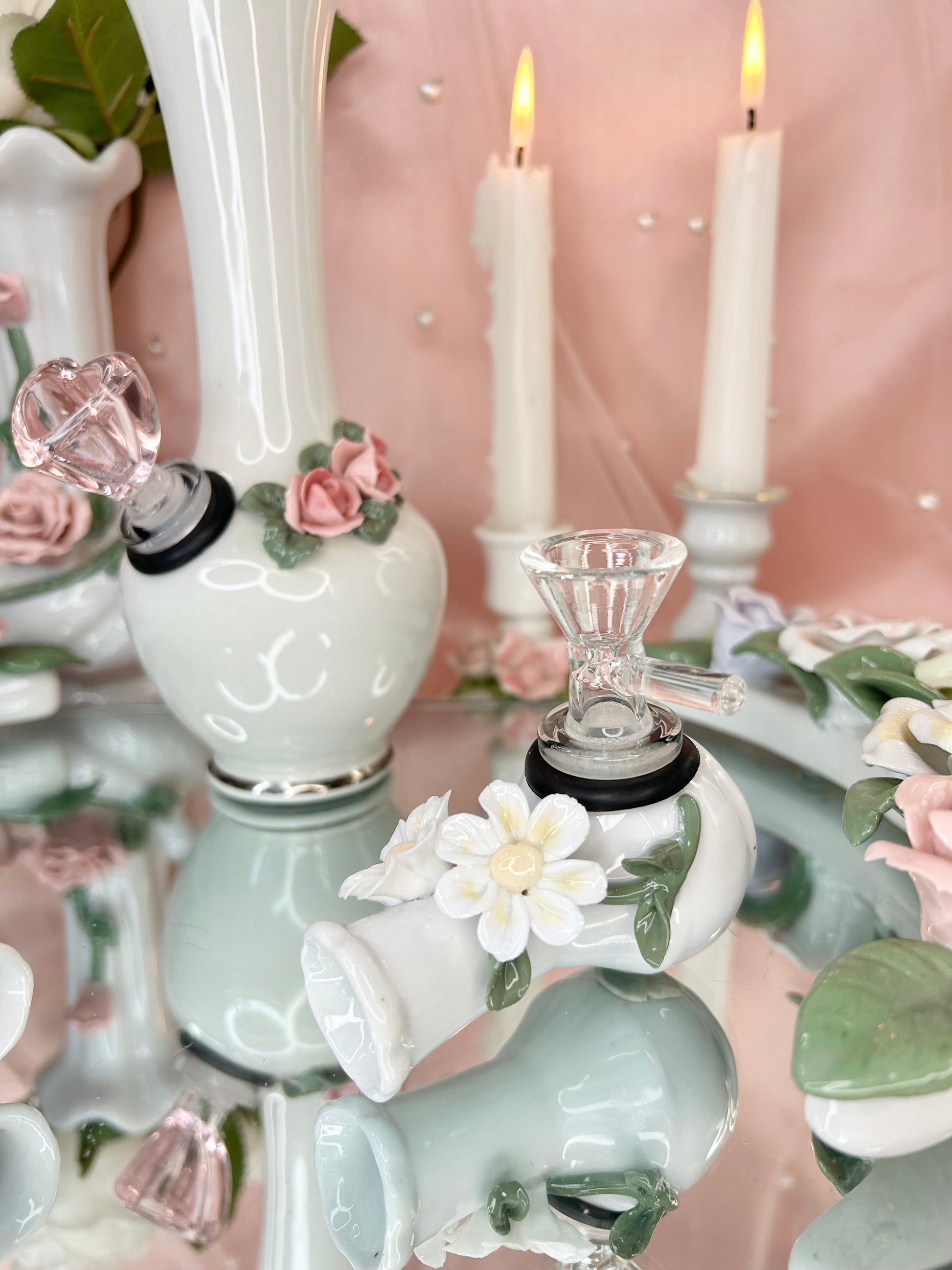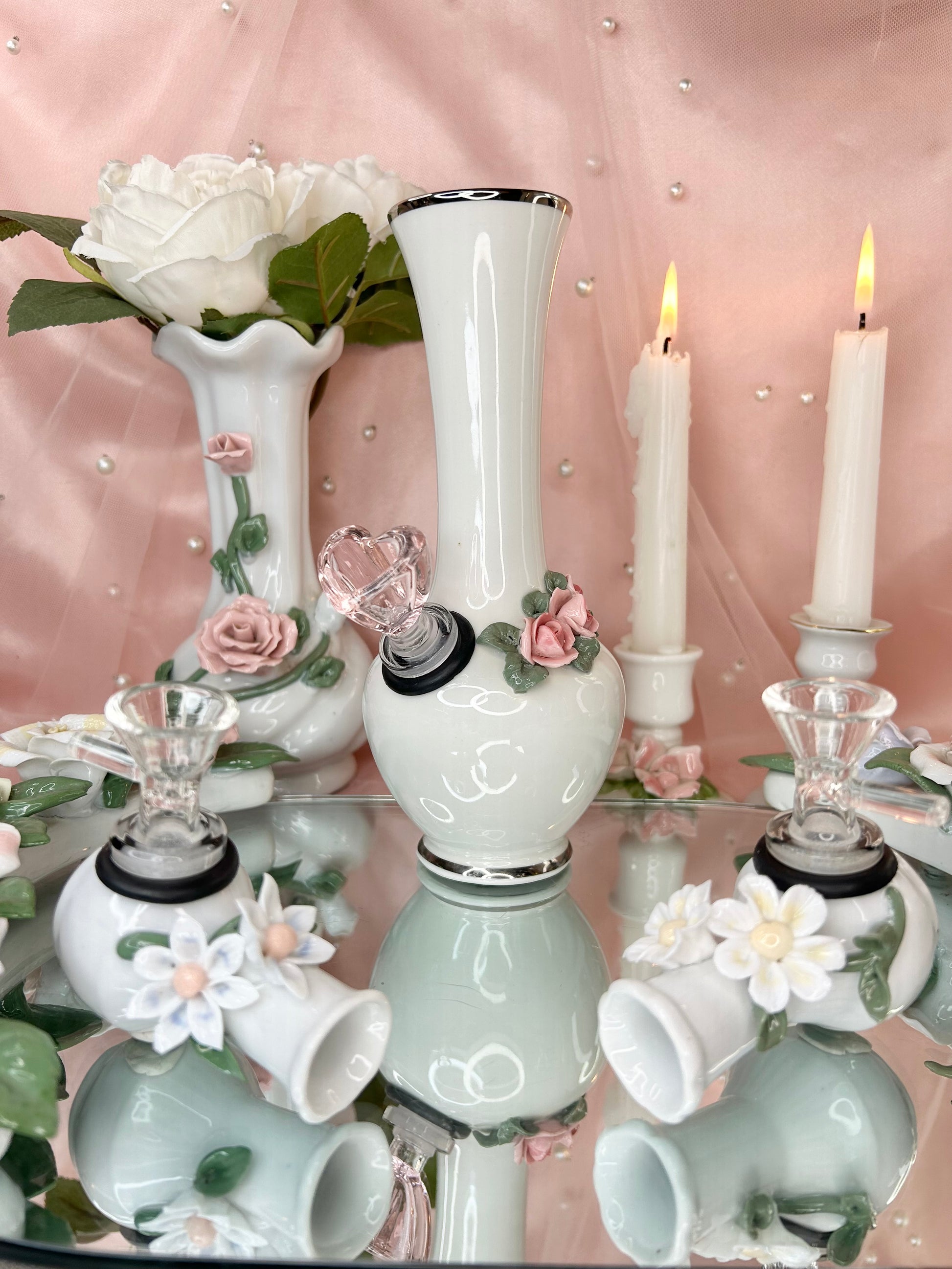 - Wedding Set includes four pipes, two rose bongs, five 14mm bowl pieces, lighters, matches, floral candle holders, candles, matching vase, porcelain leaf joint holder, four ashtrays and floral mirror tray to display it all