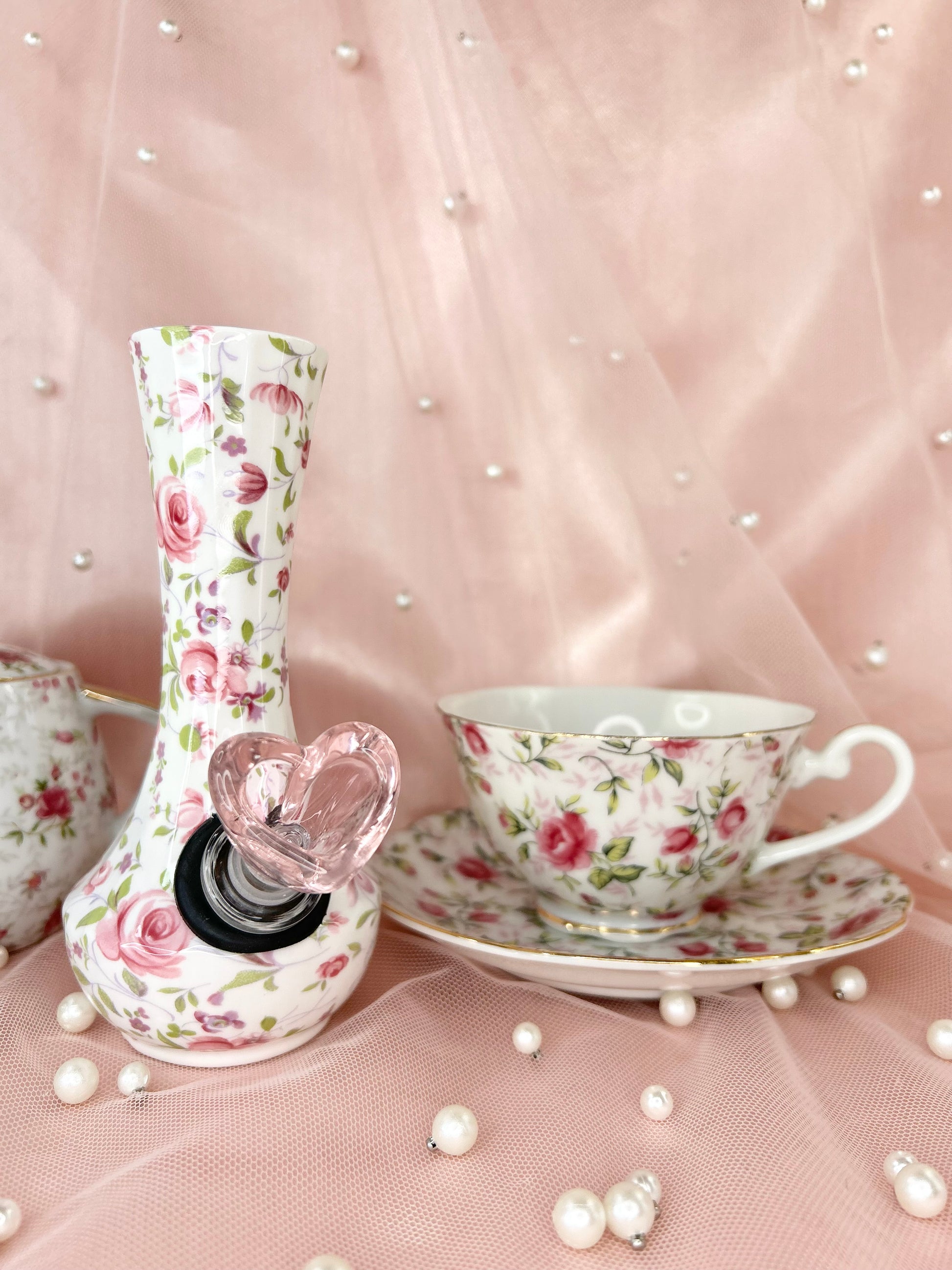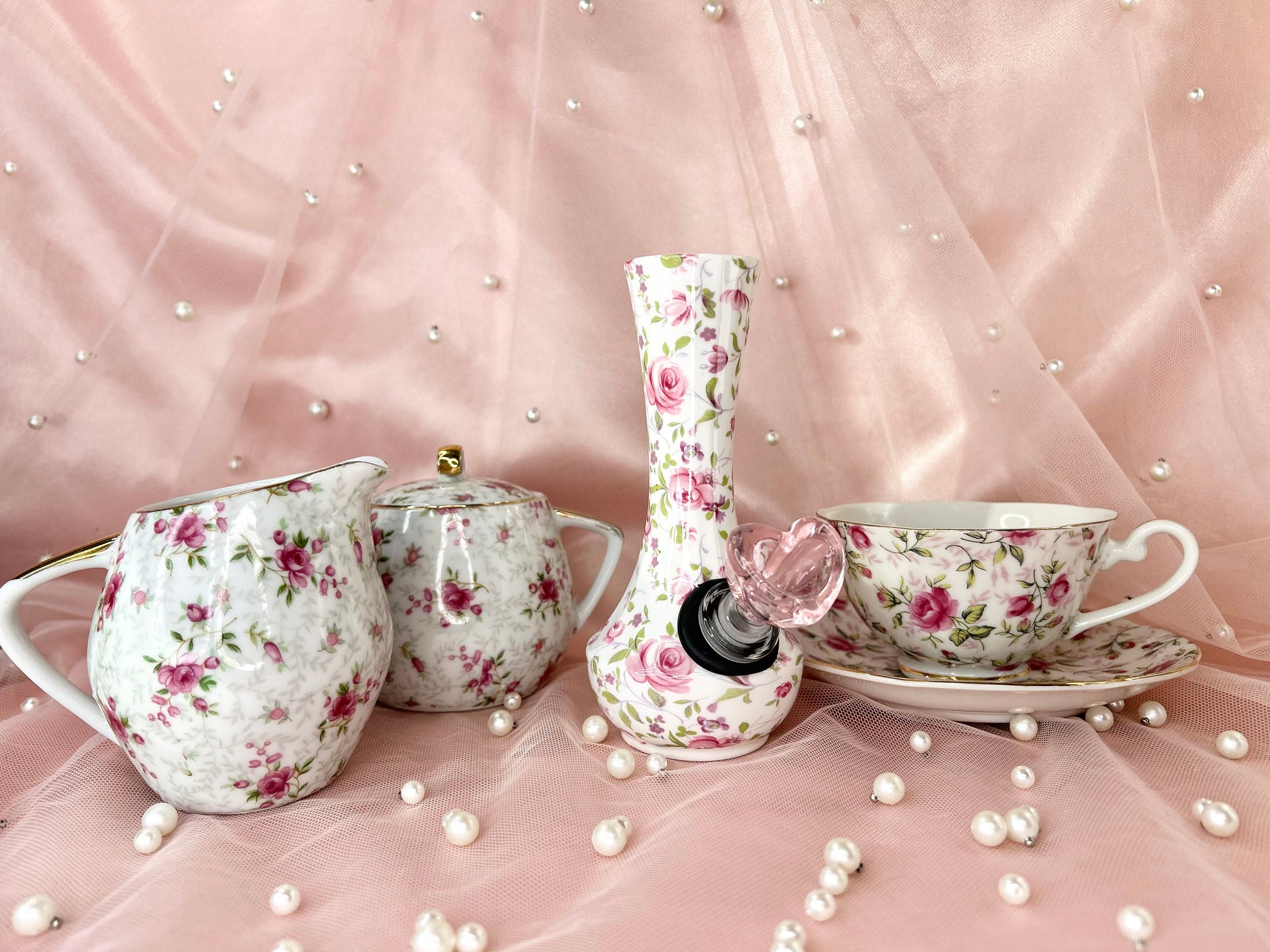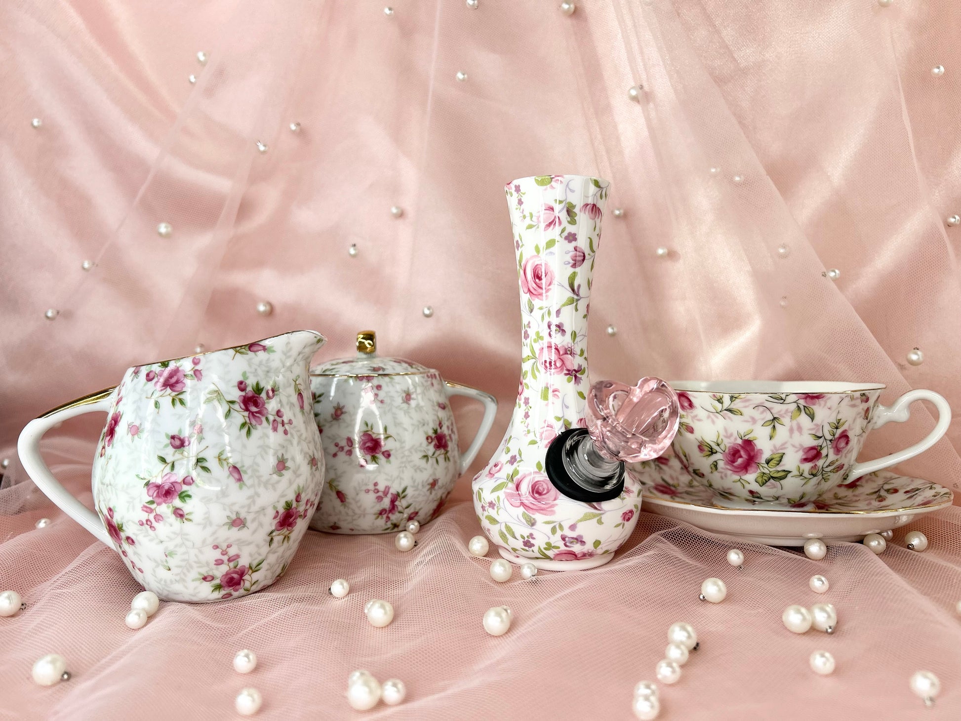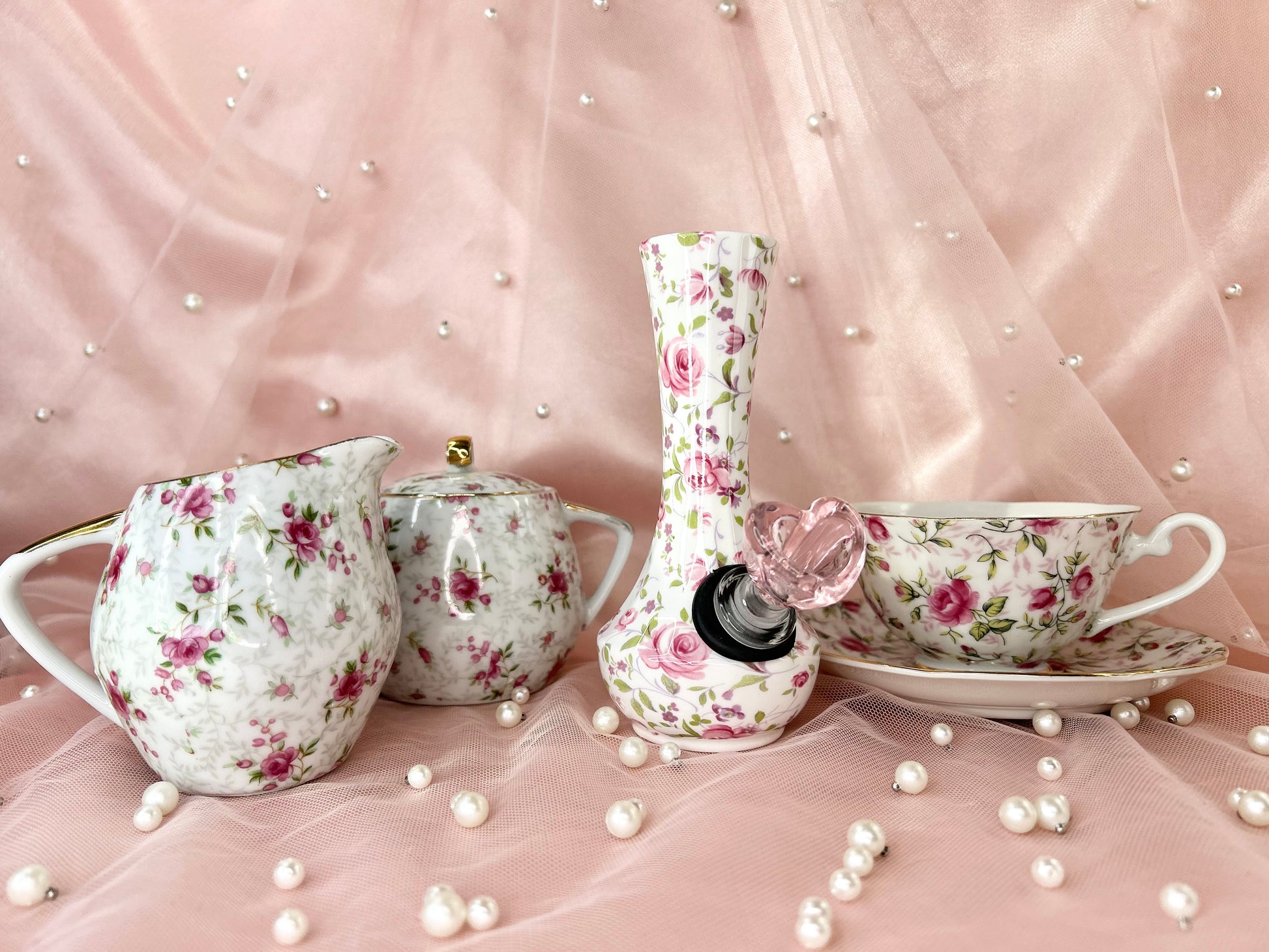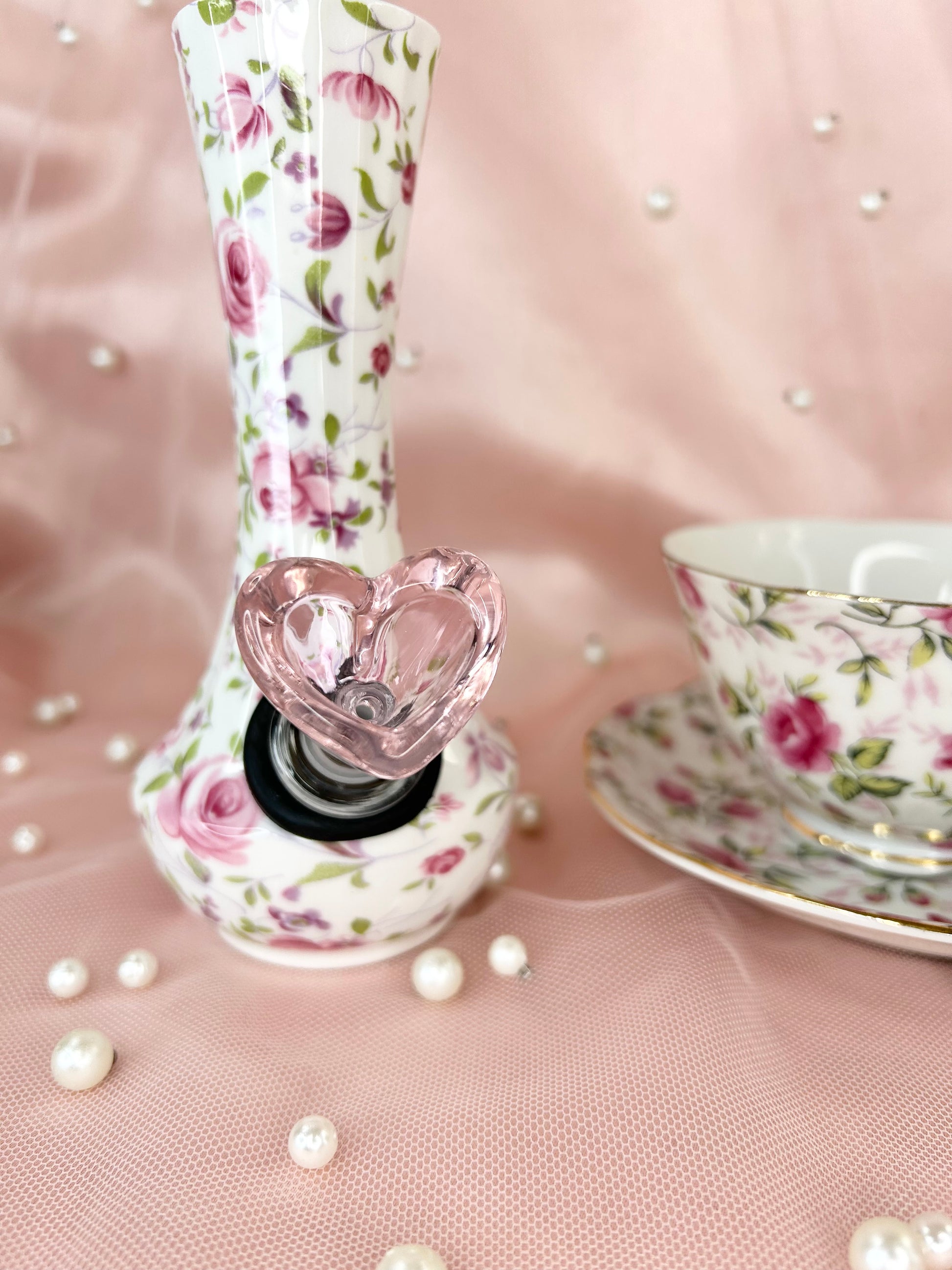 • Includes pipe, 14mm pink glass heart bowl, tea cup, plate, sugar and creamer pitcher