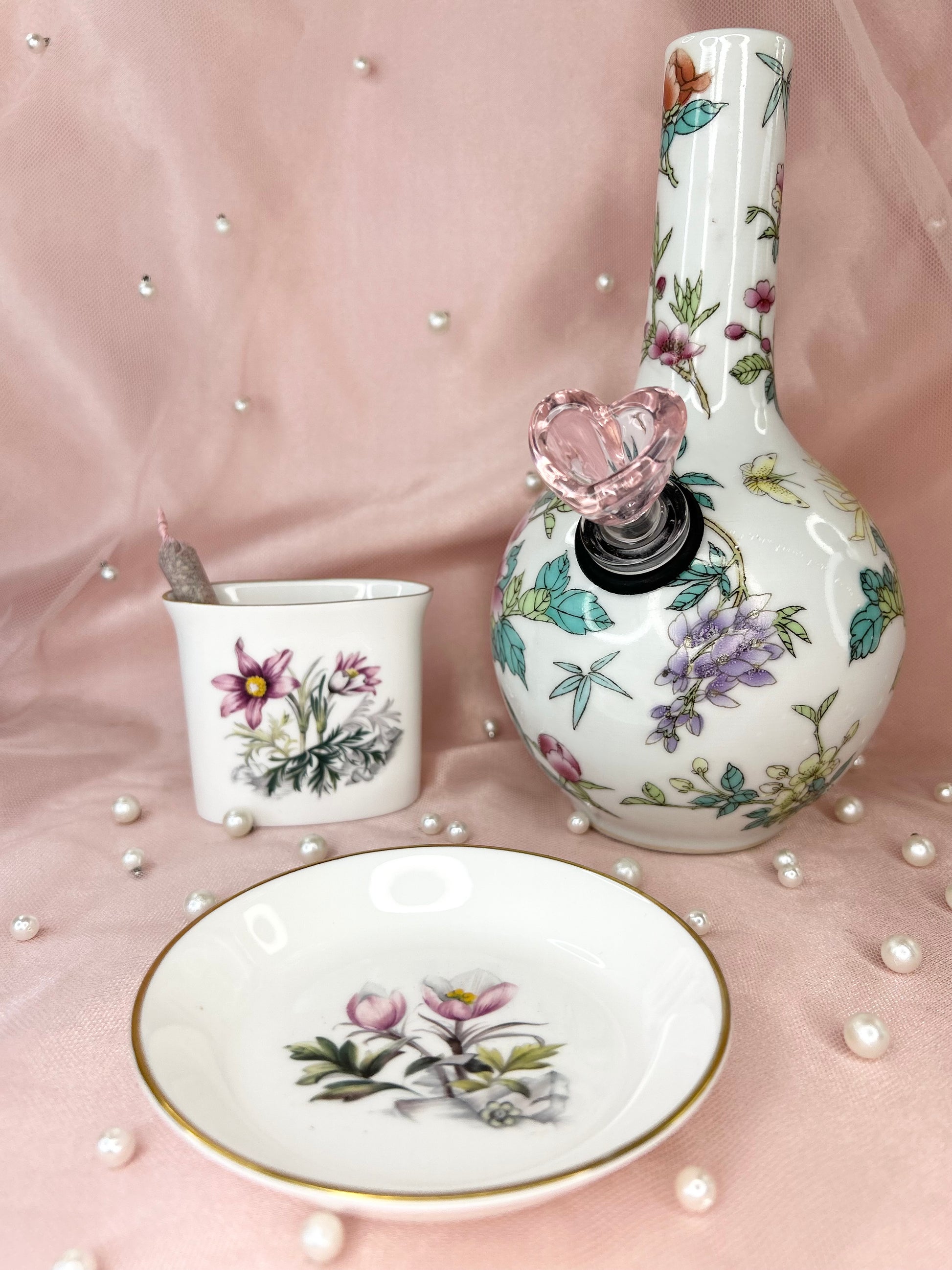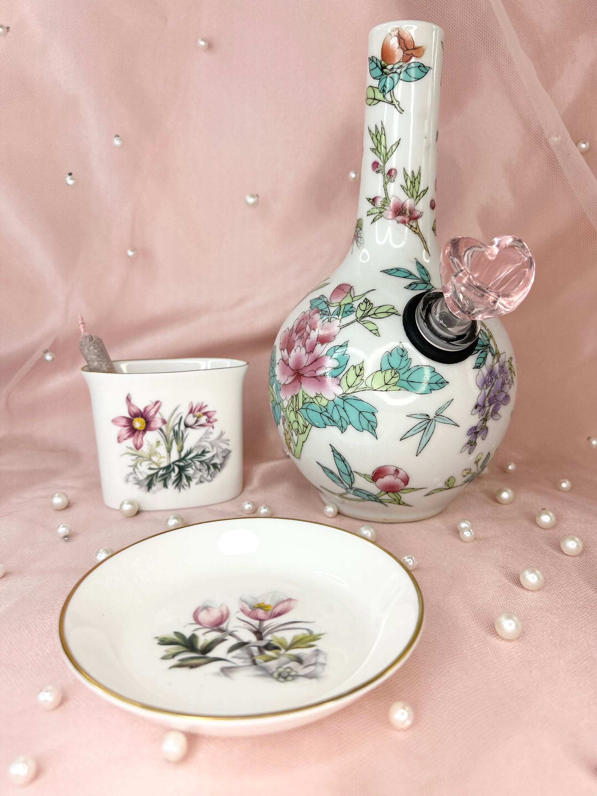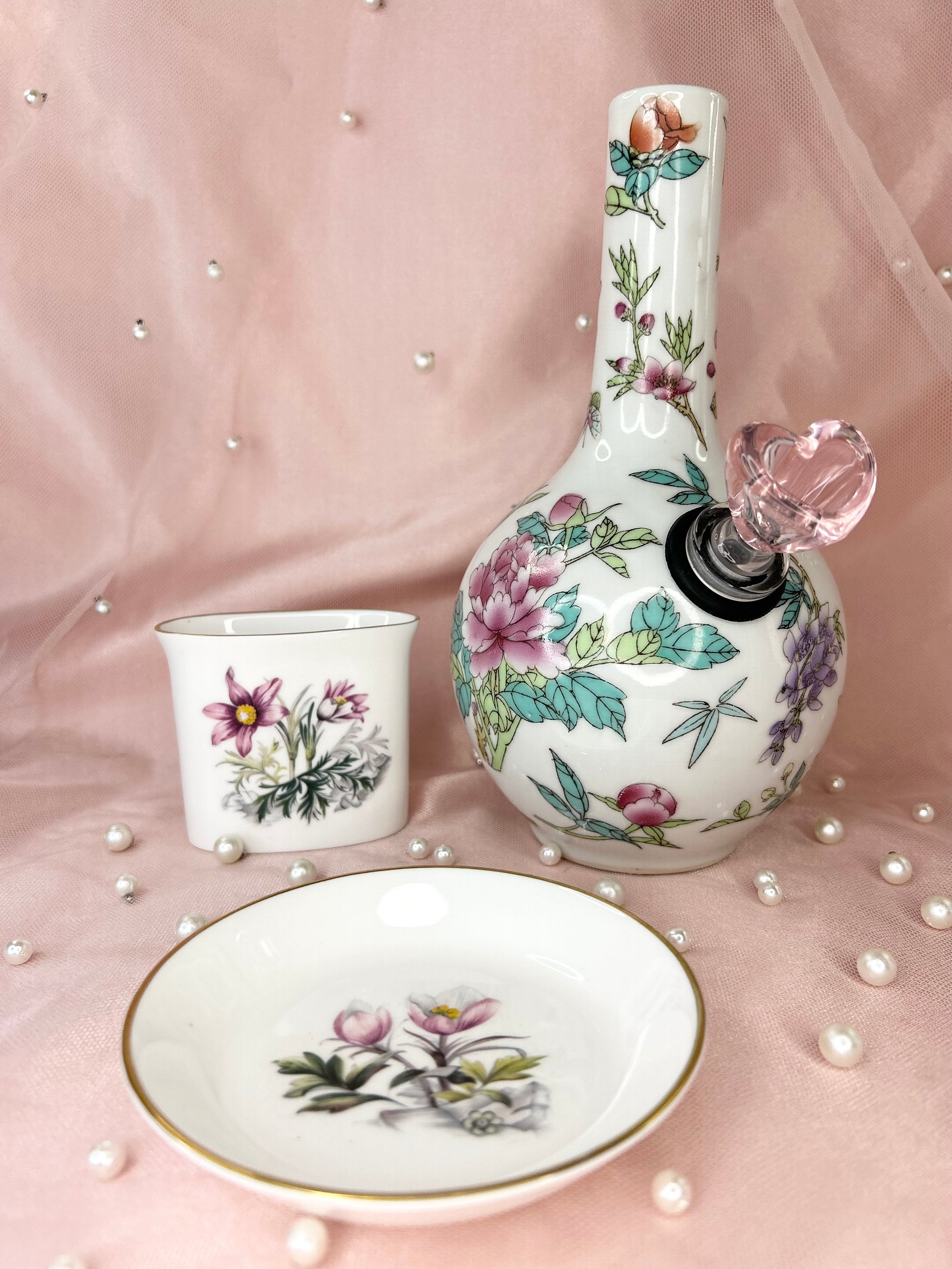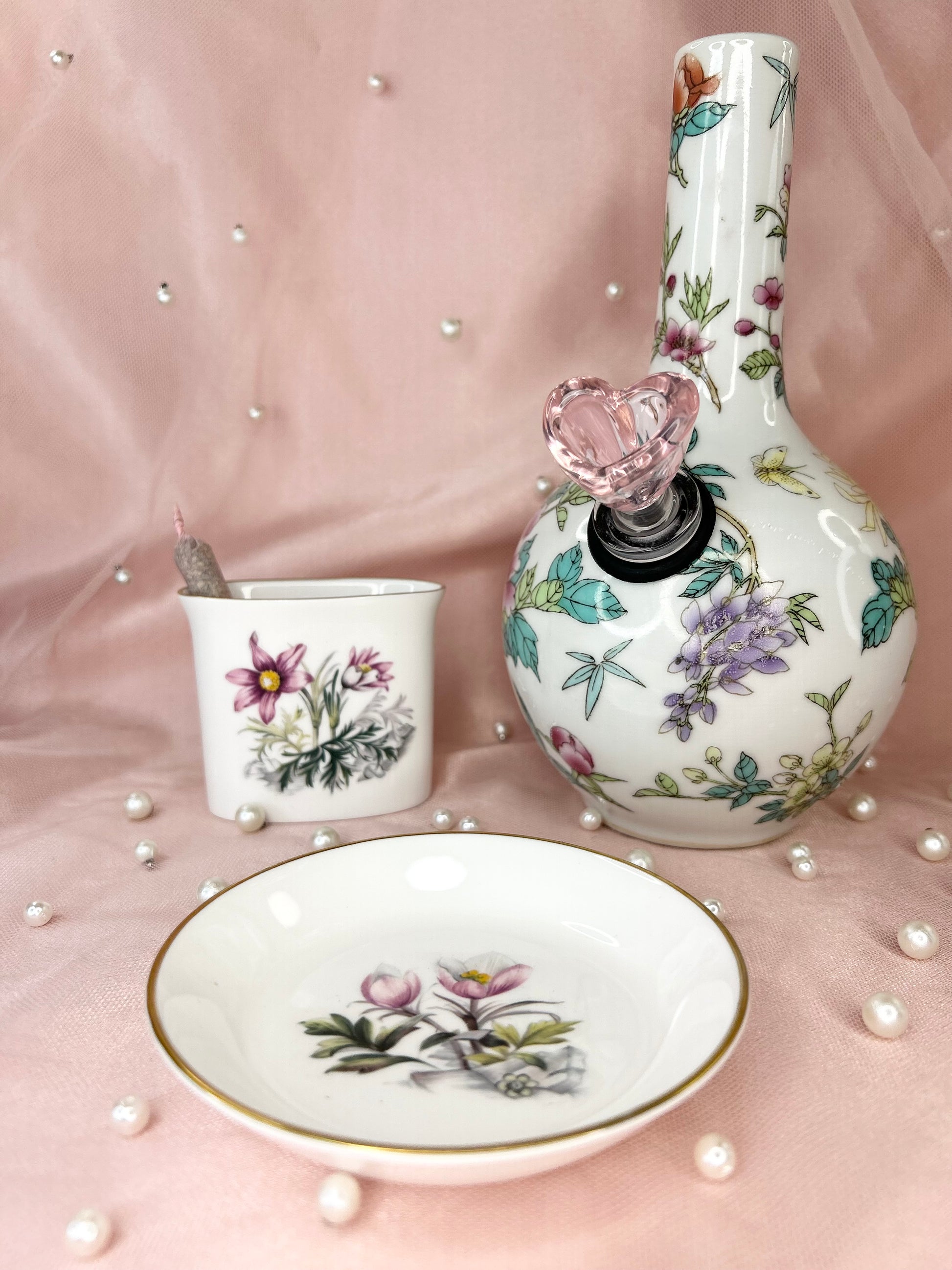 - Includes 14mm pink glass heart bowl, bong, holder and matching floral ashtray