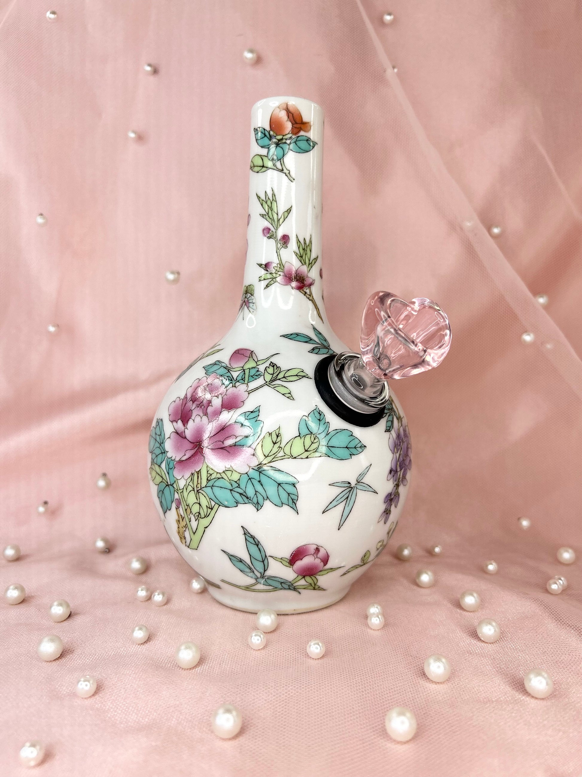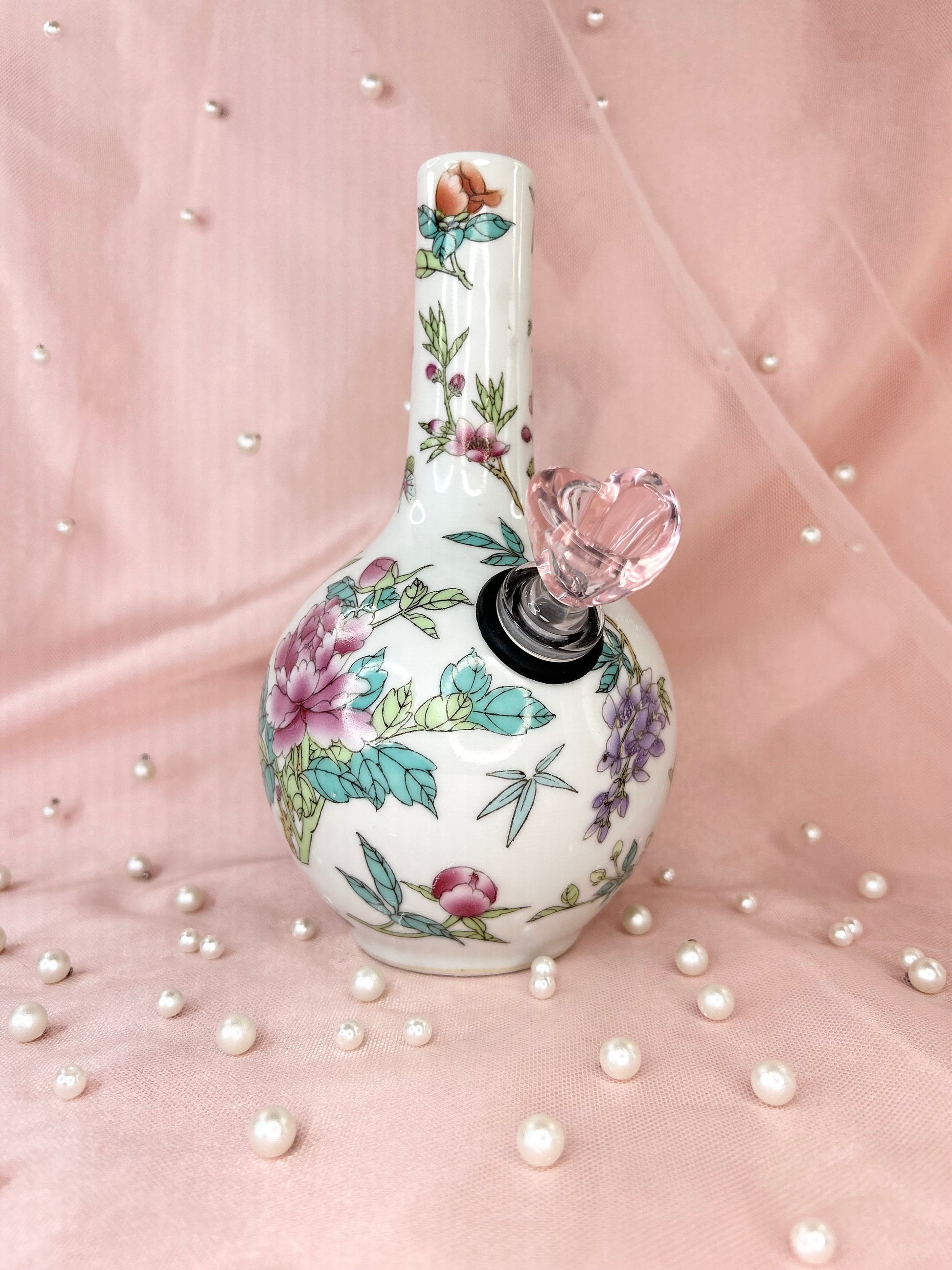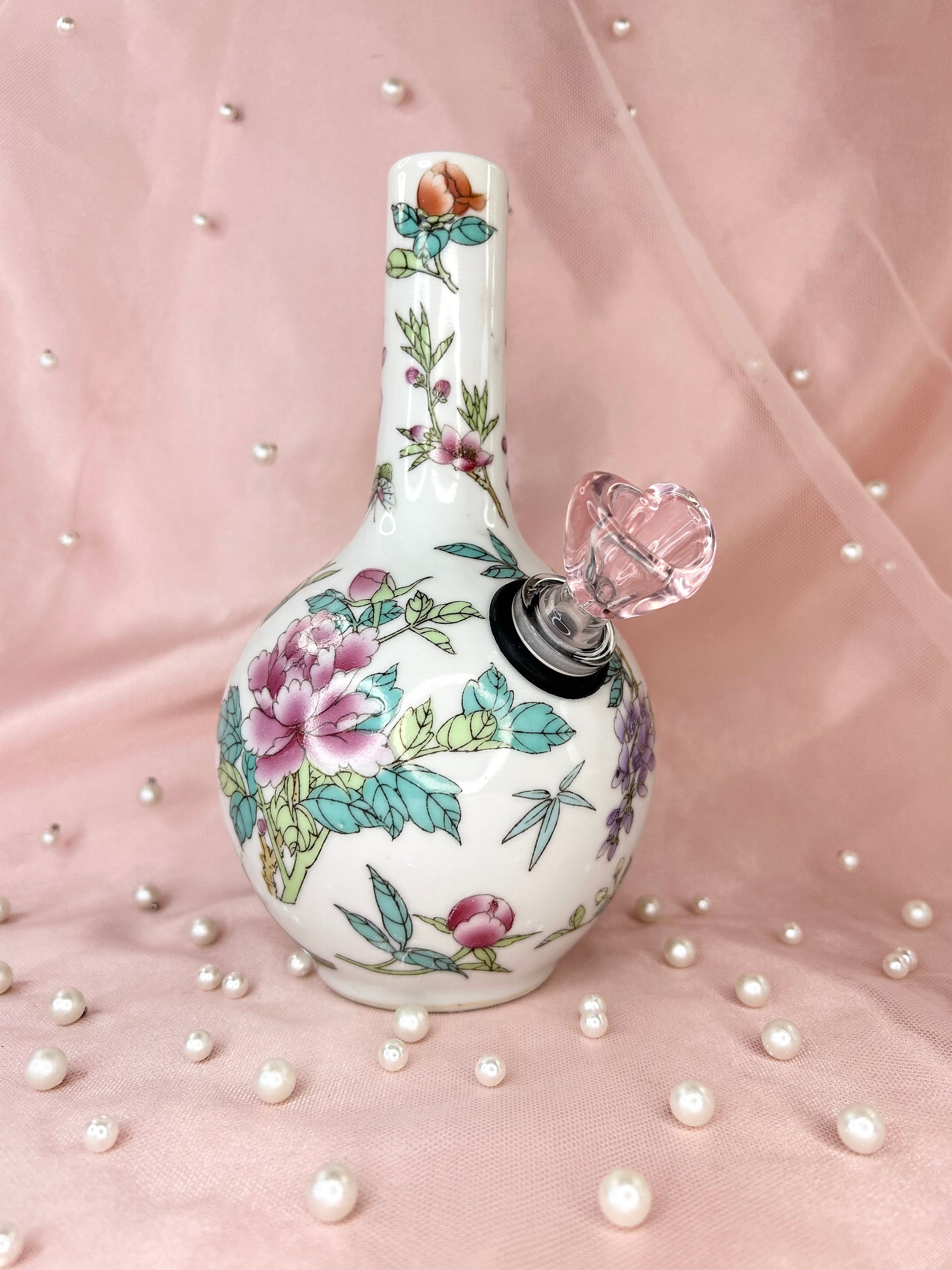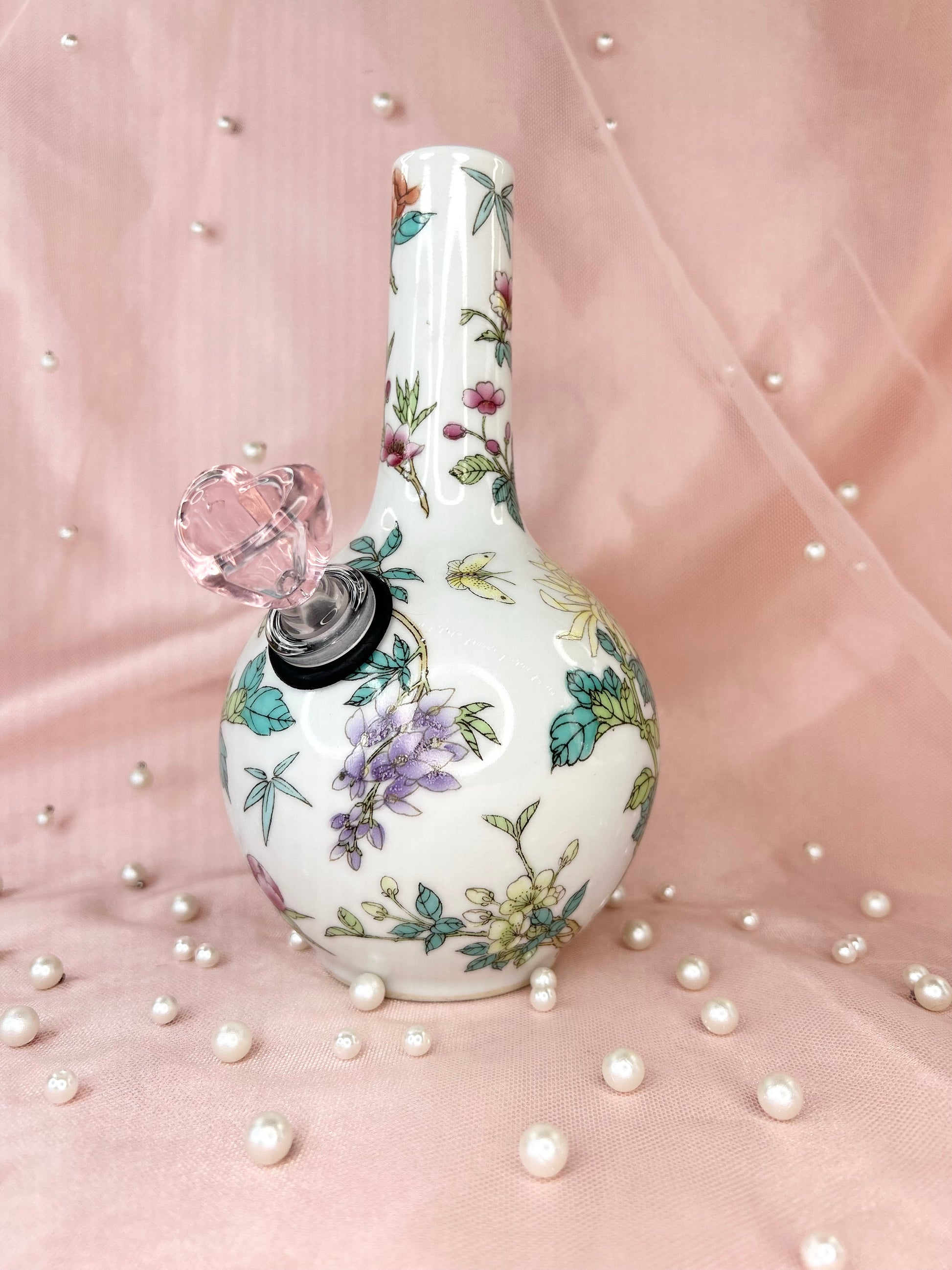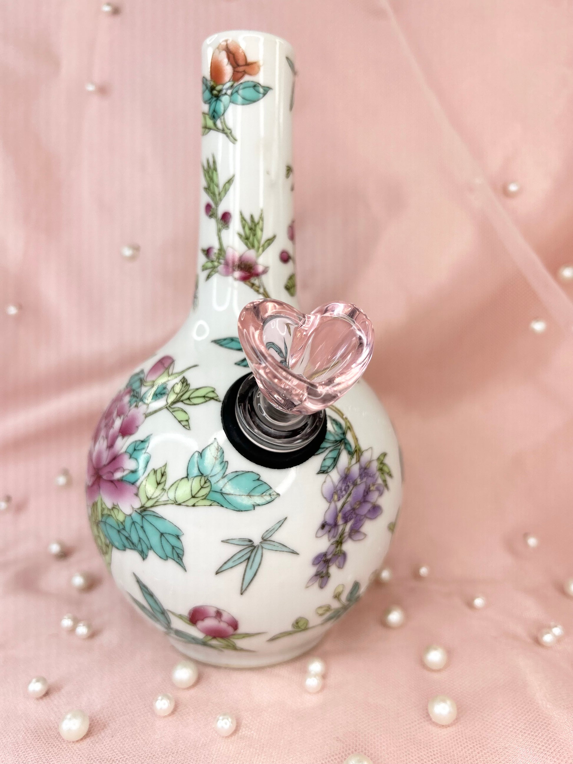 - Includes 14mm pink glass heart bowl, bong, holder and matching floral ashtray
