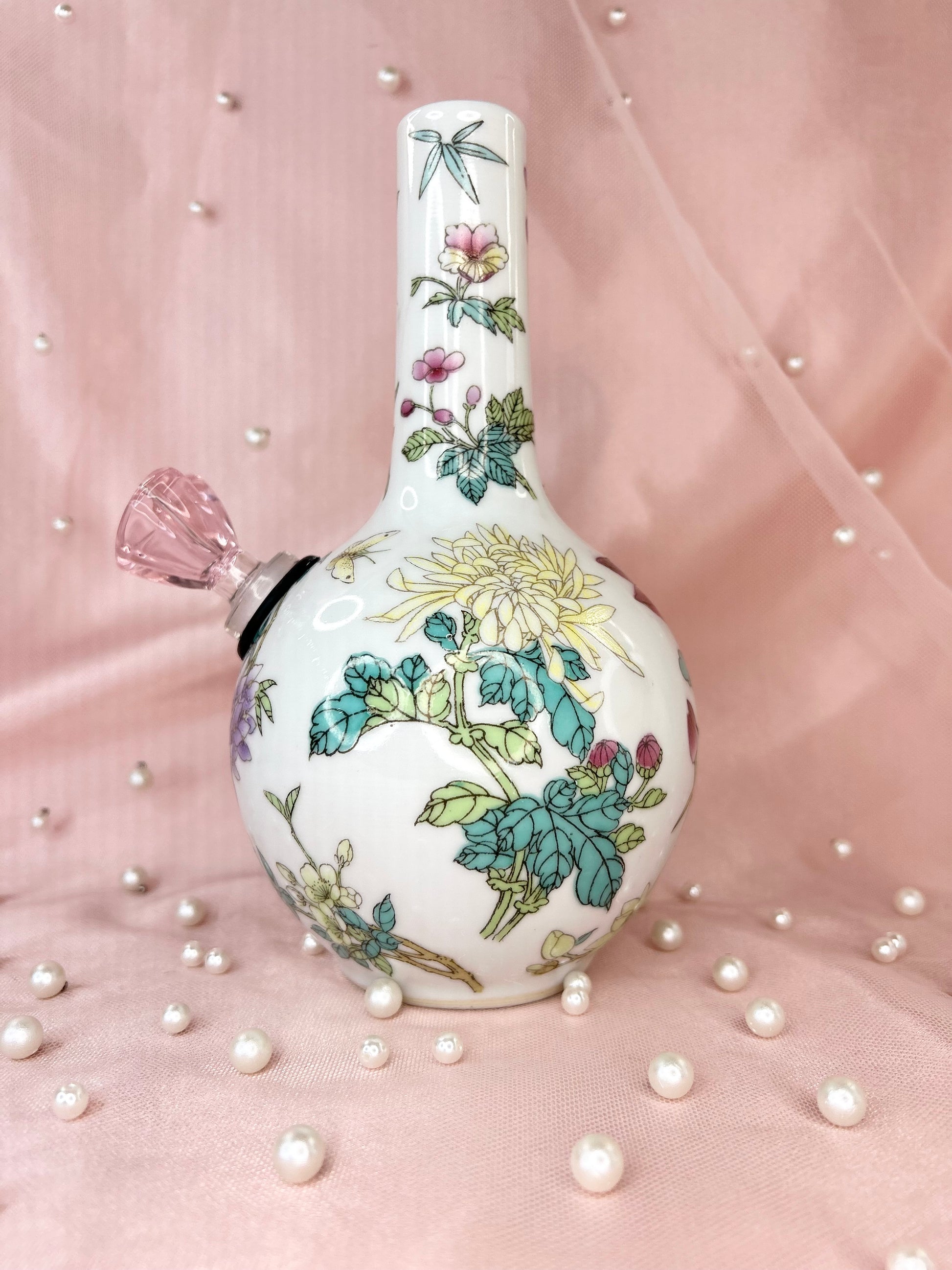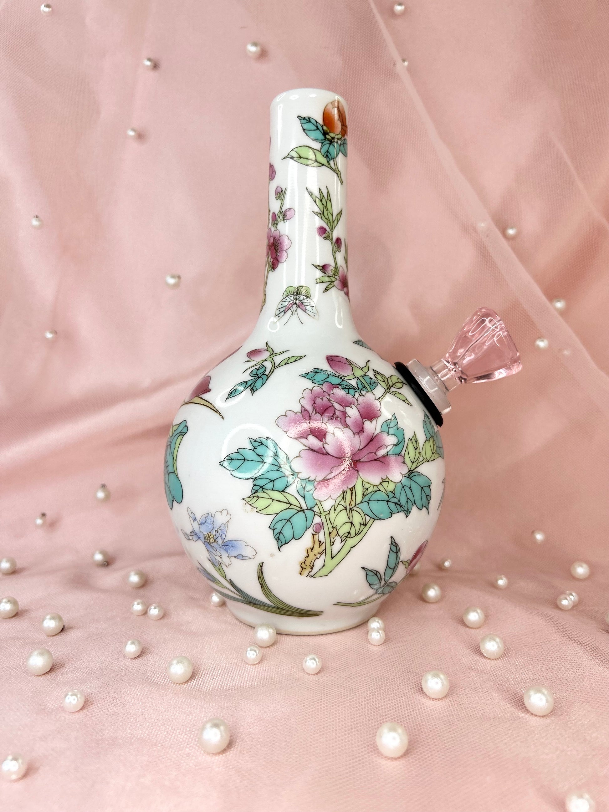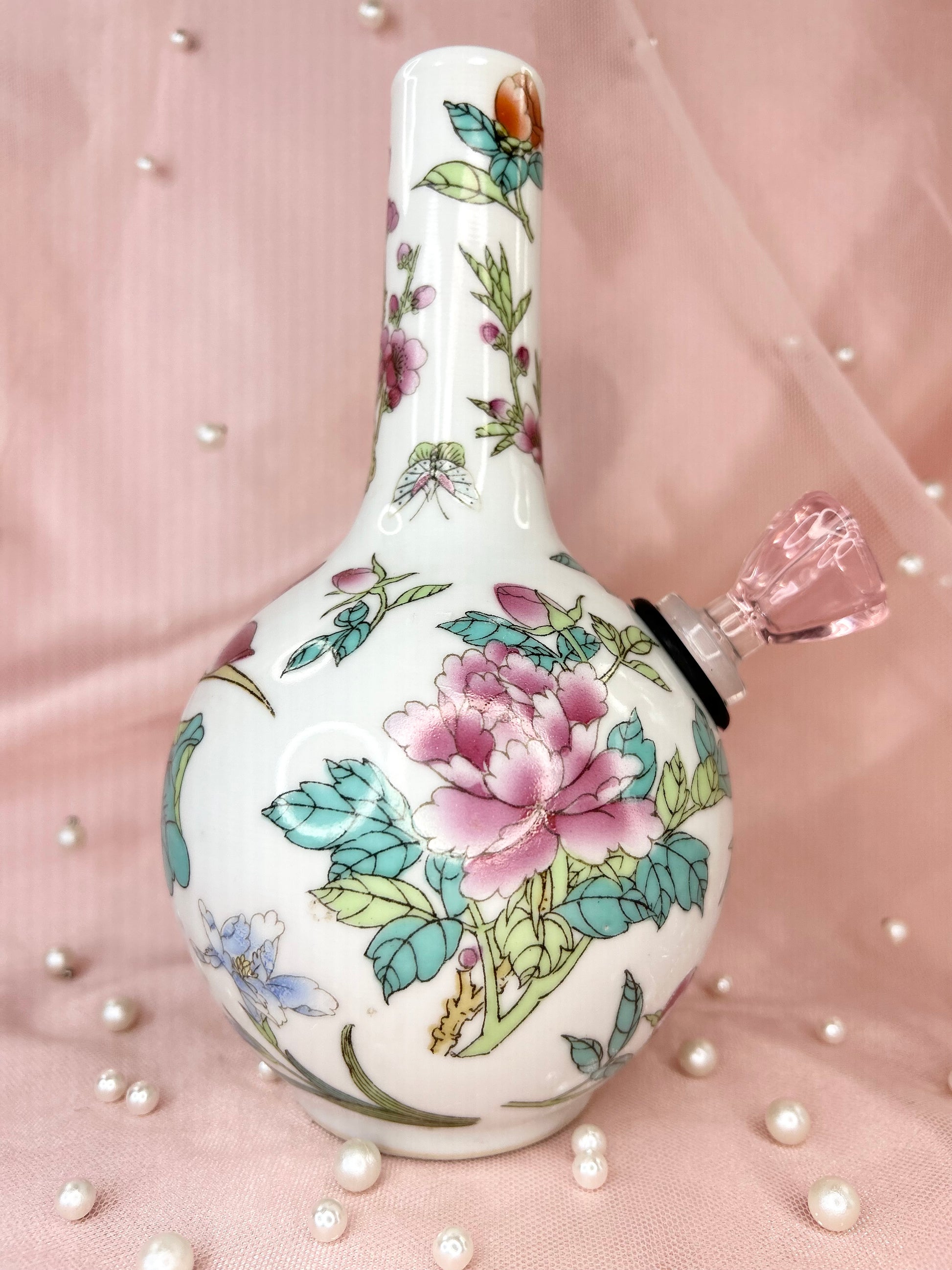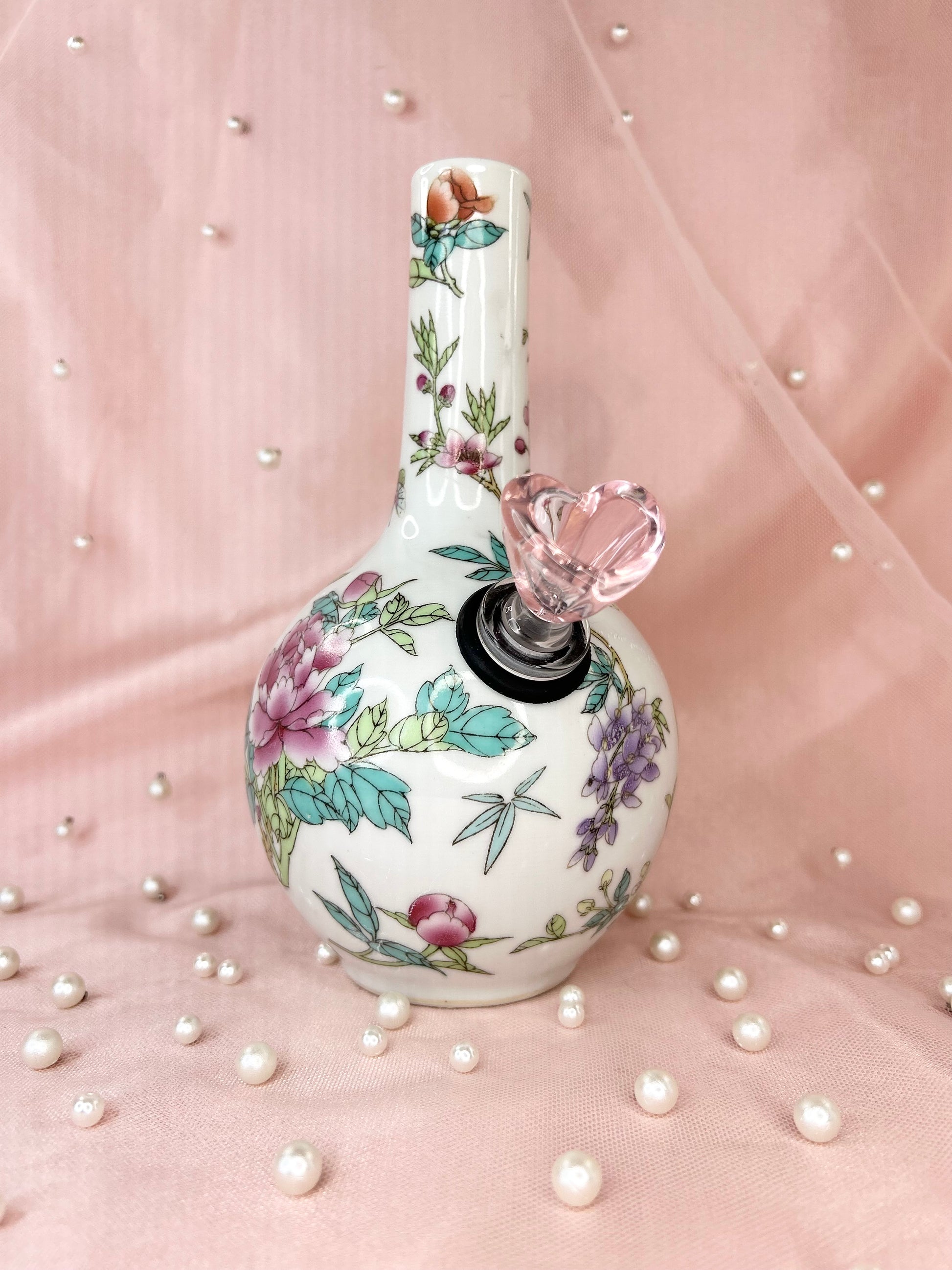 - Includes 14mm pink glass heart bowl, bong, holder and matching floral ashtray