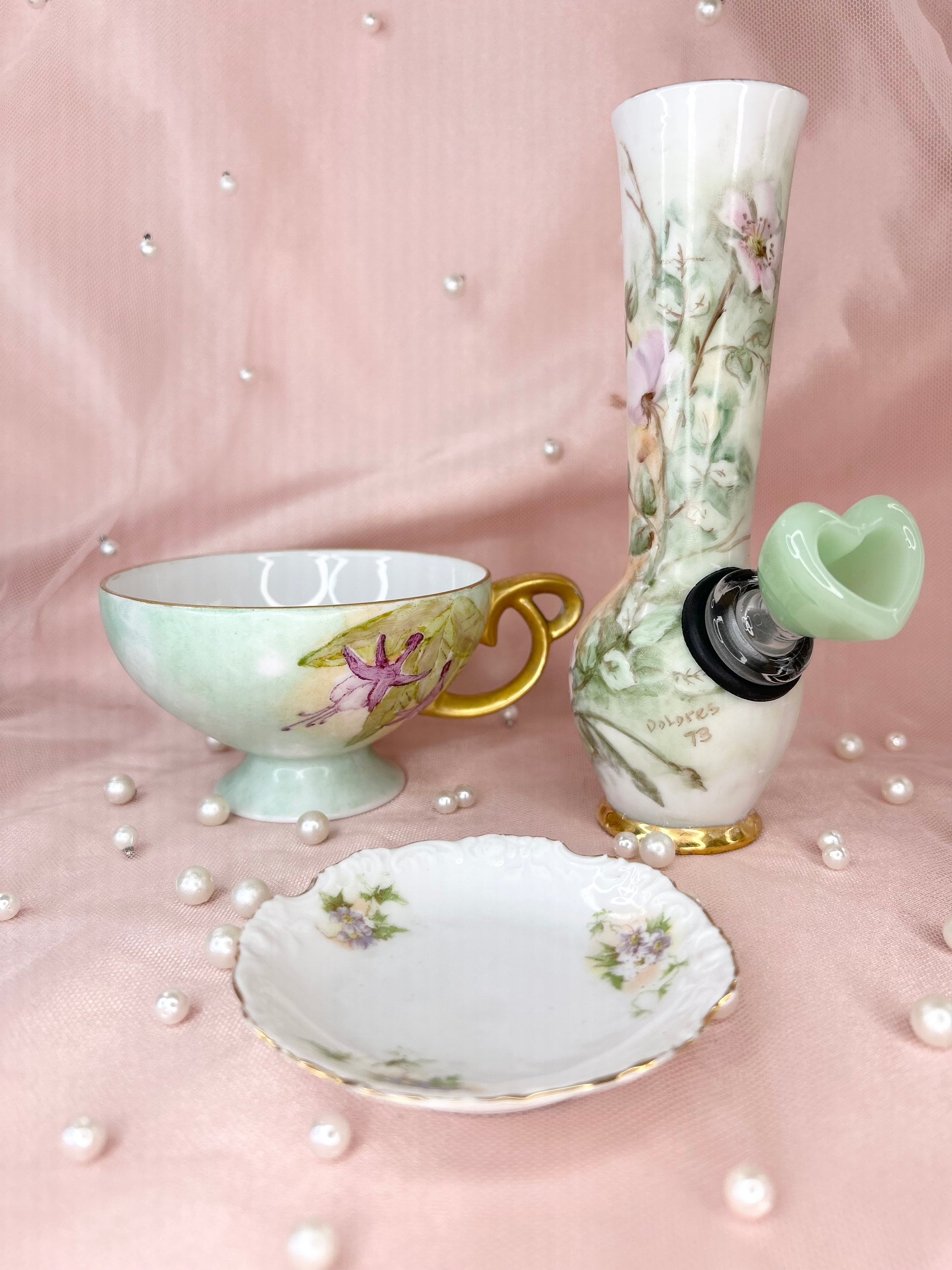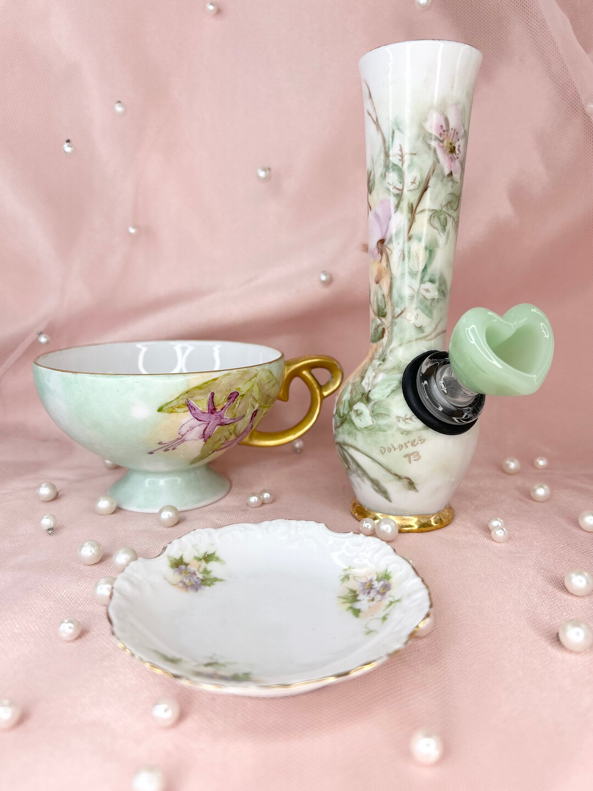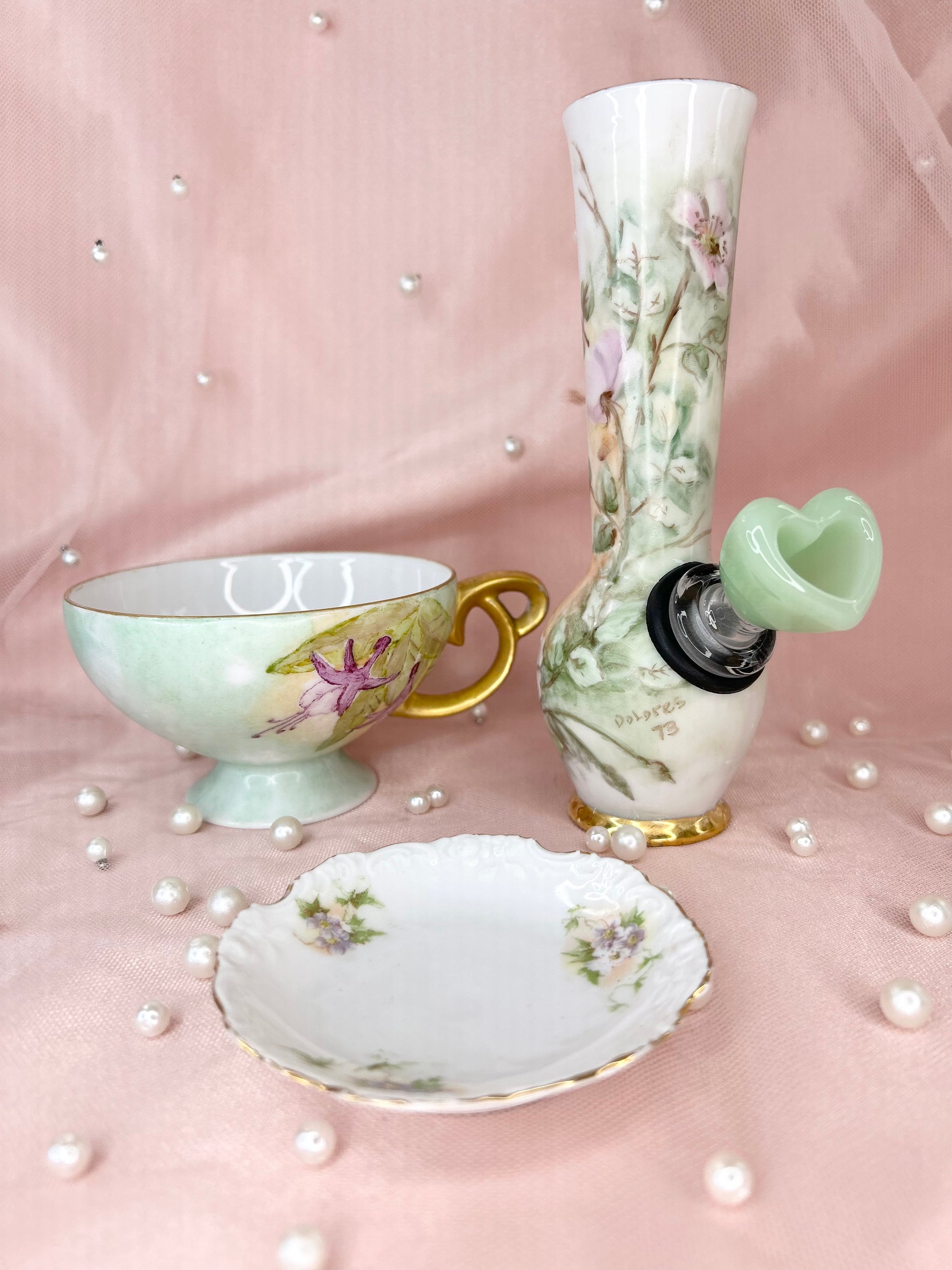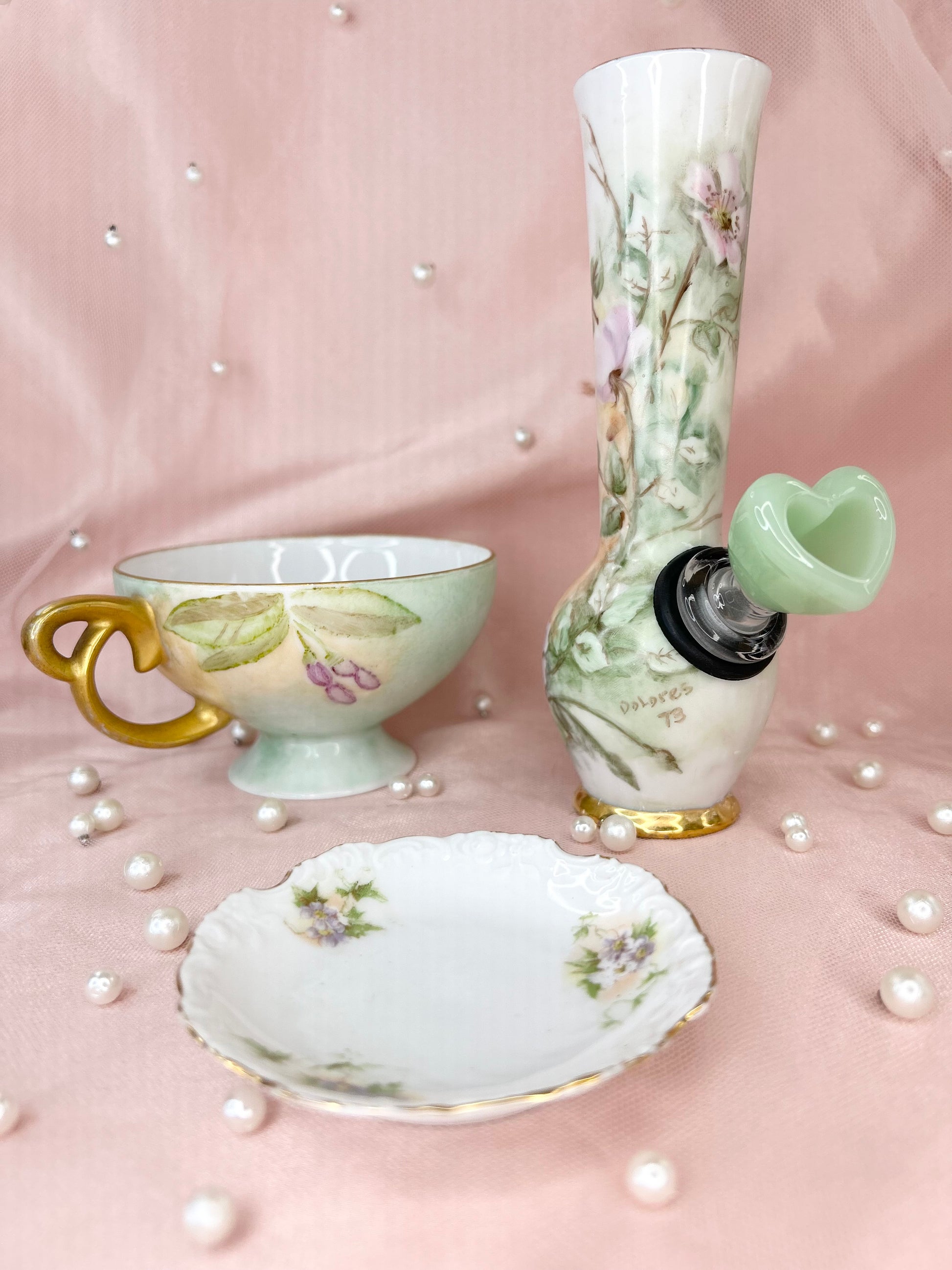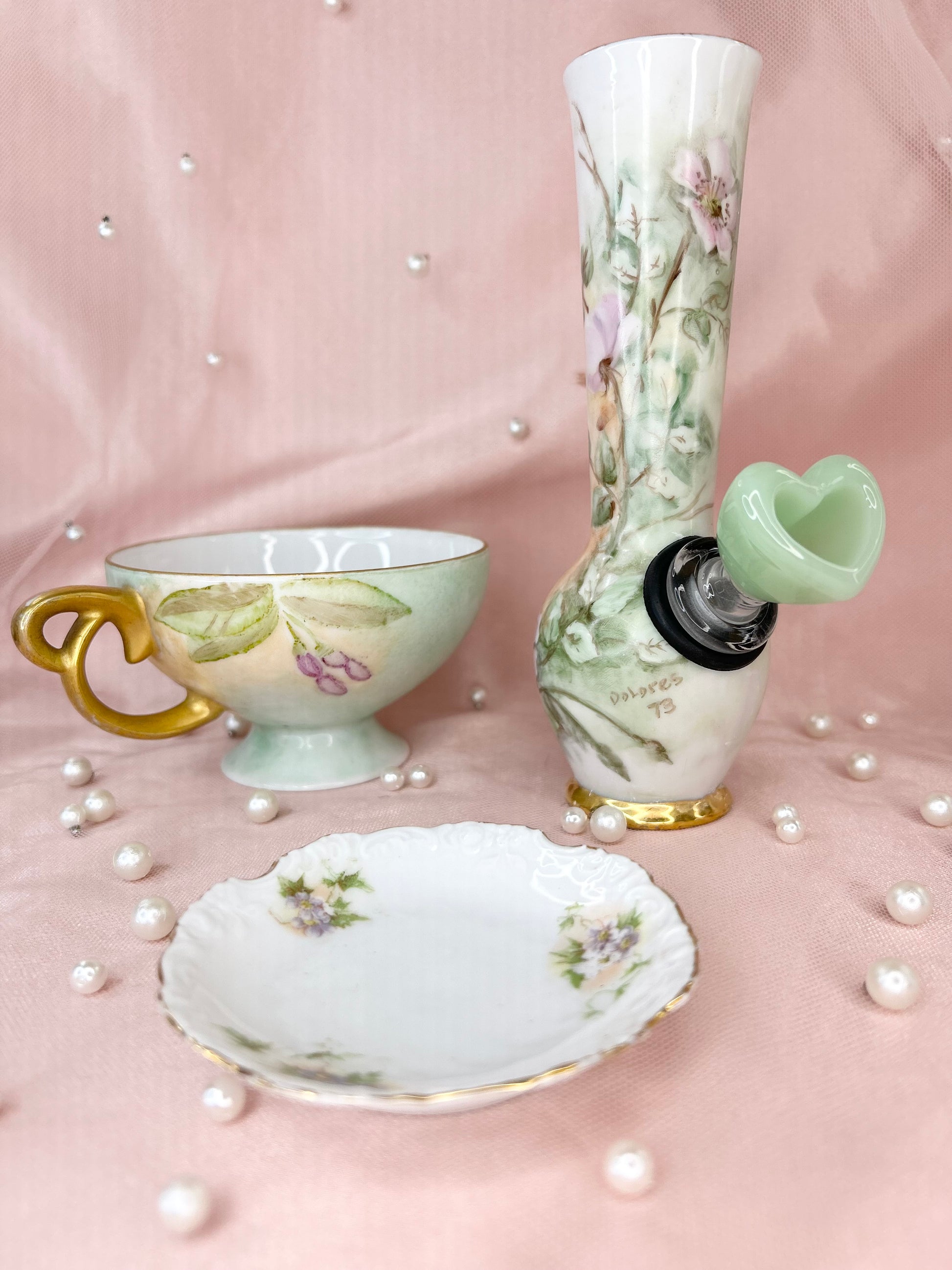 - Includes pipe, 14mm green heart glass bowl piece, ashtray and floral tea cup