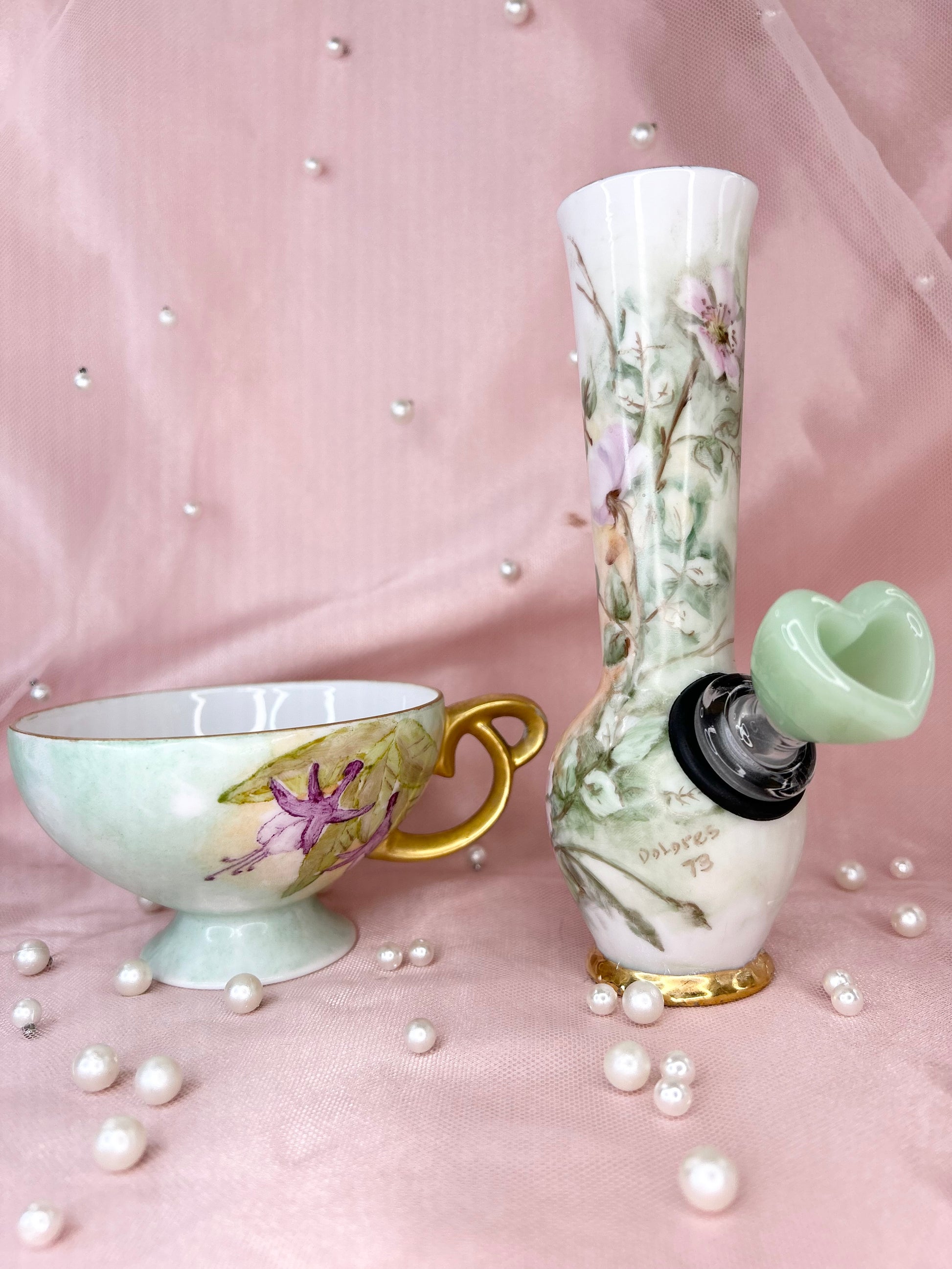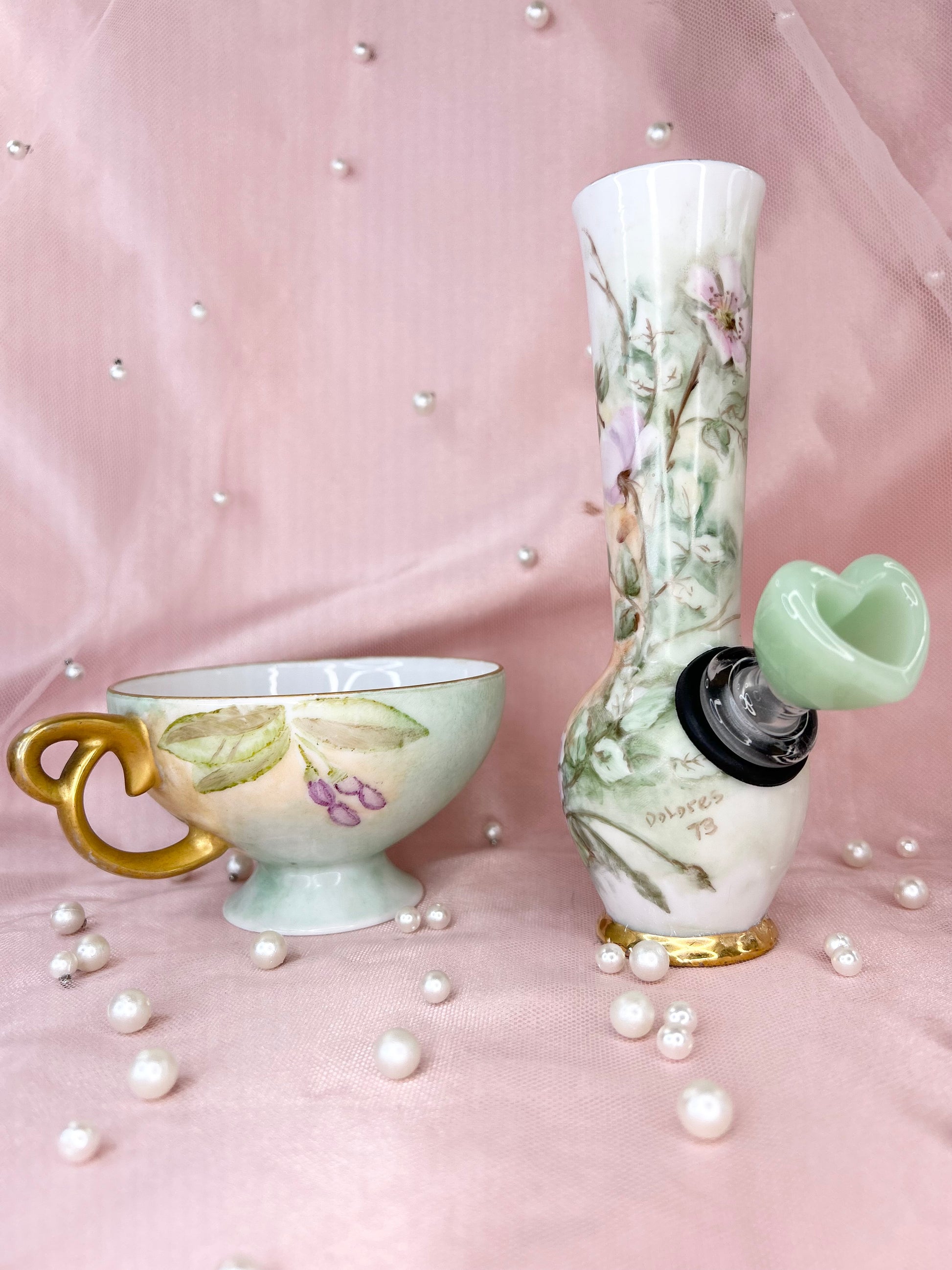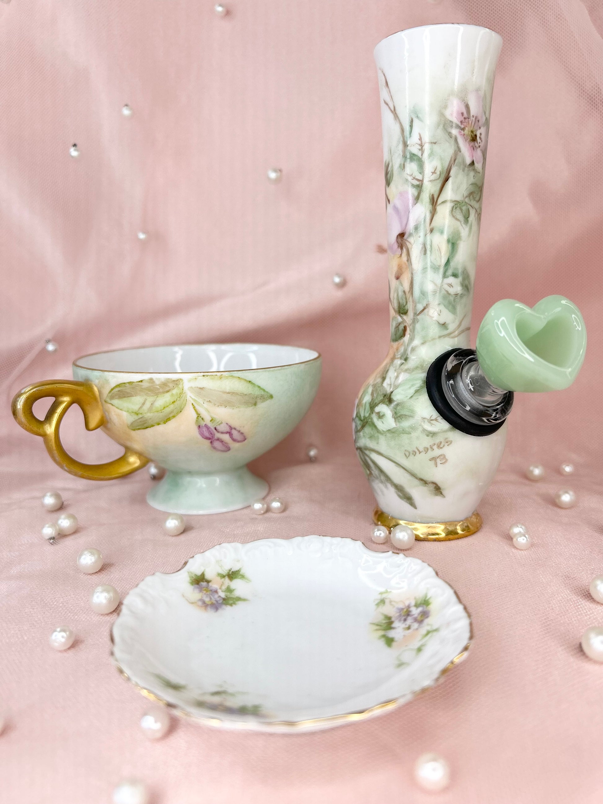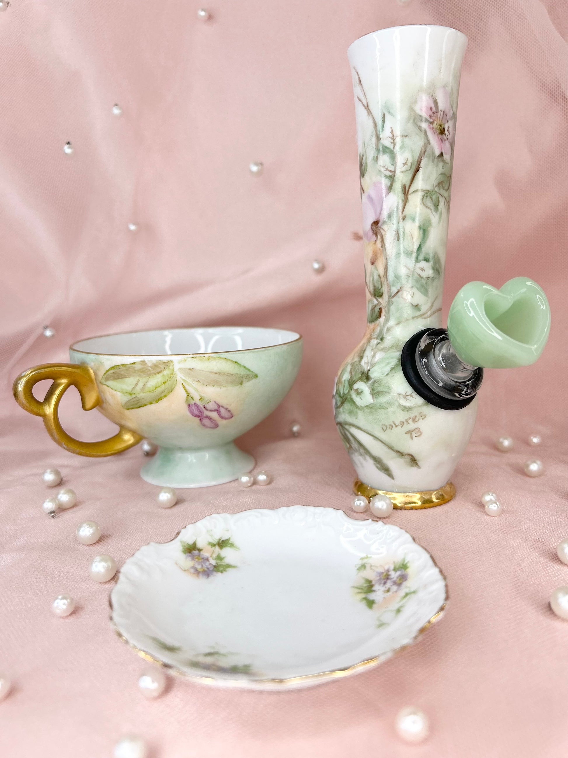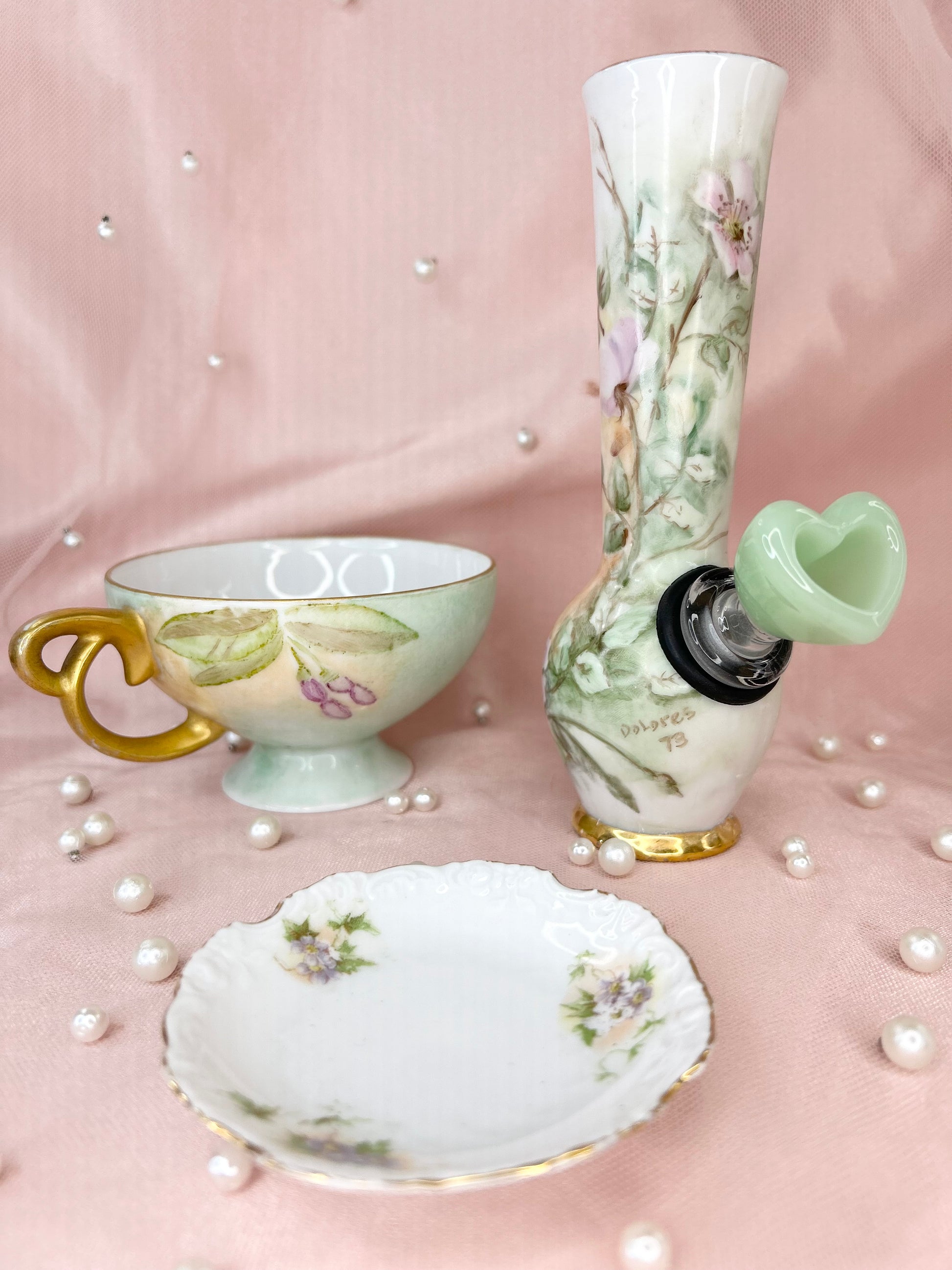 - Includes pipe, 14mm green heart glass bowl piece, ashtray and floral tea cup