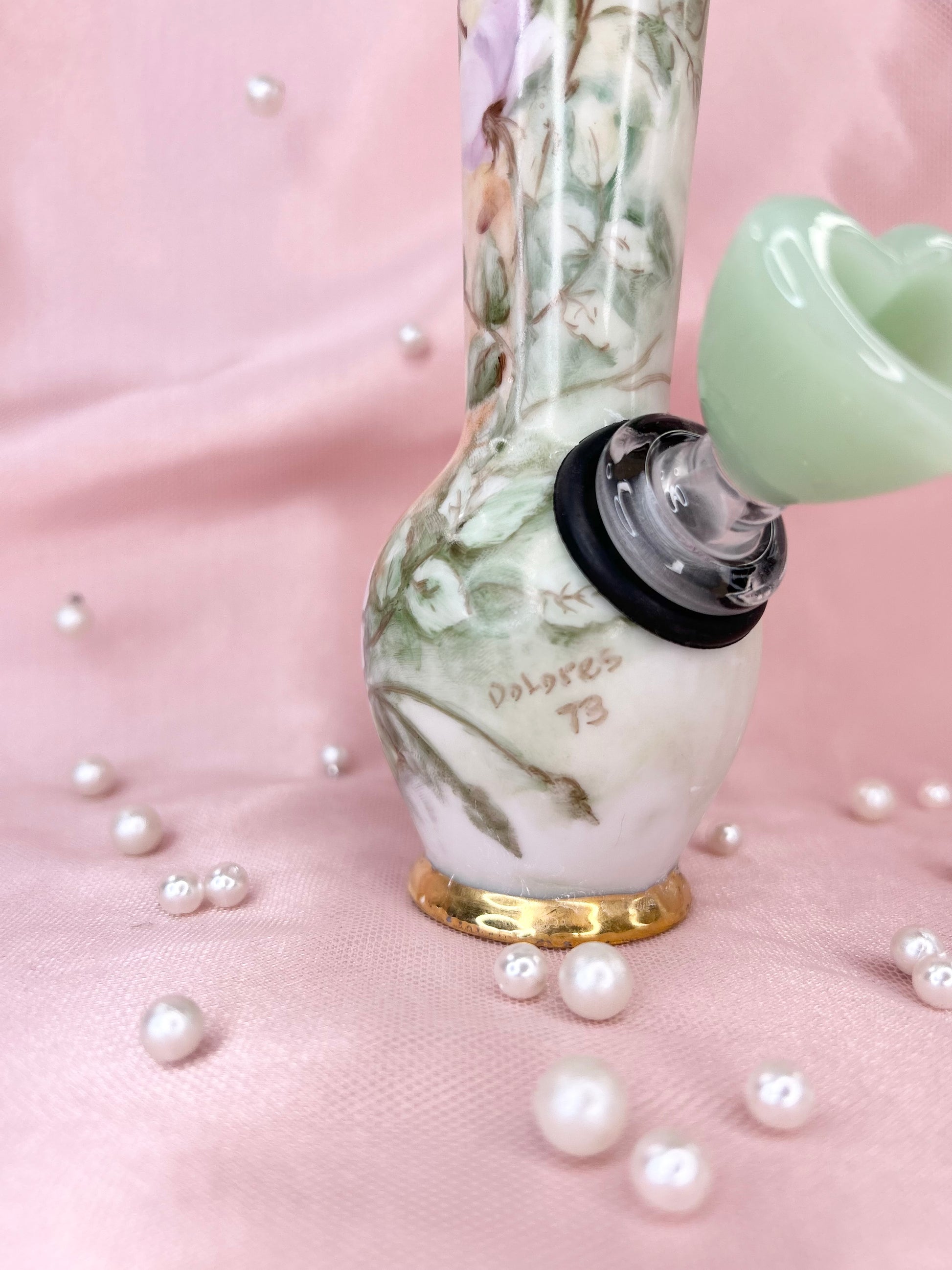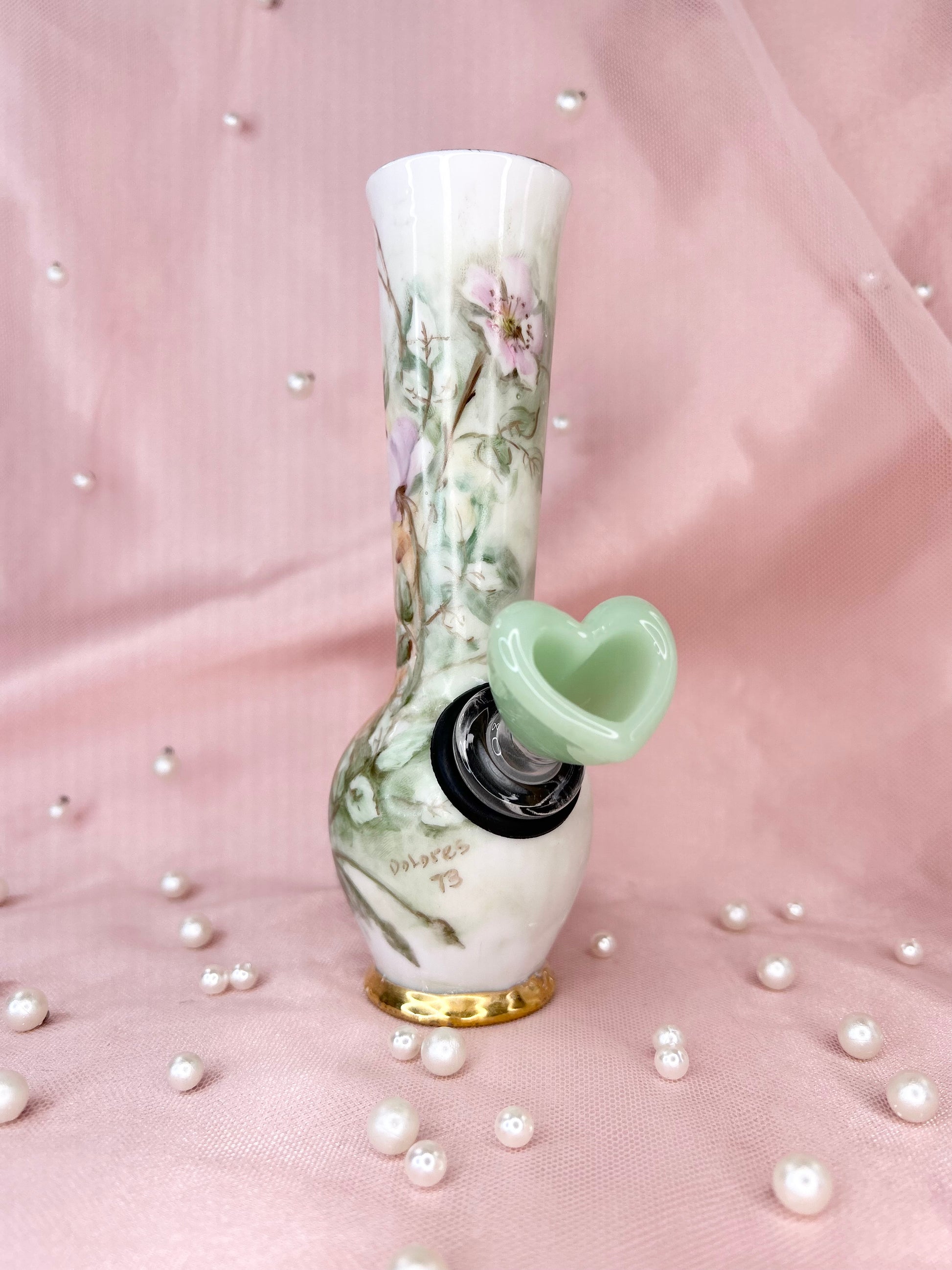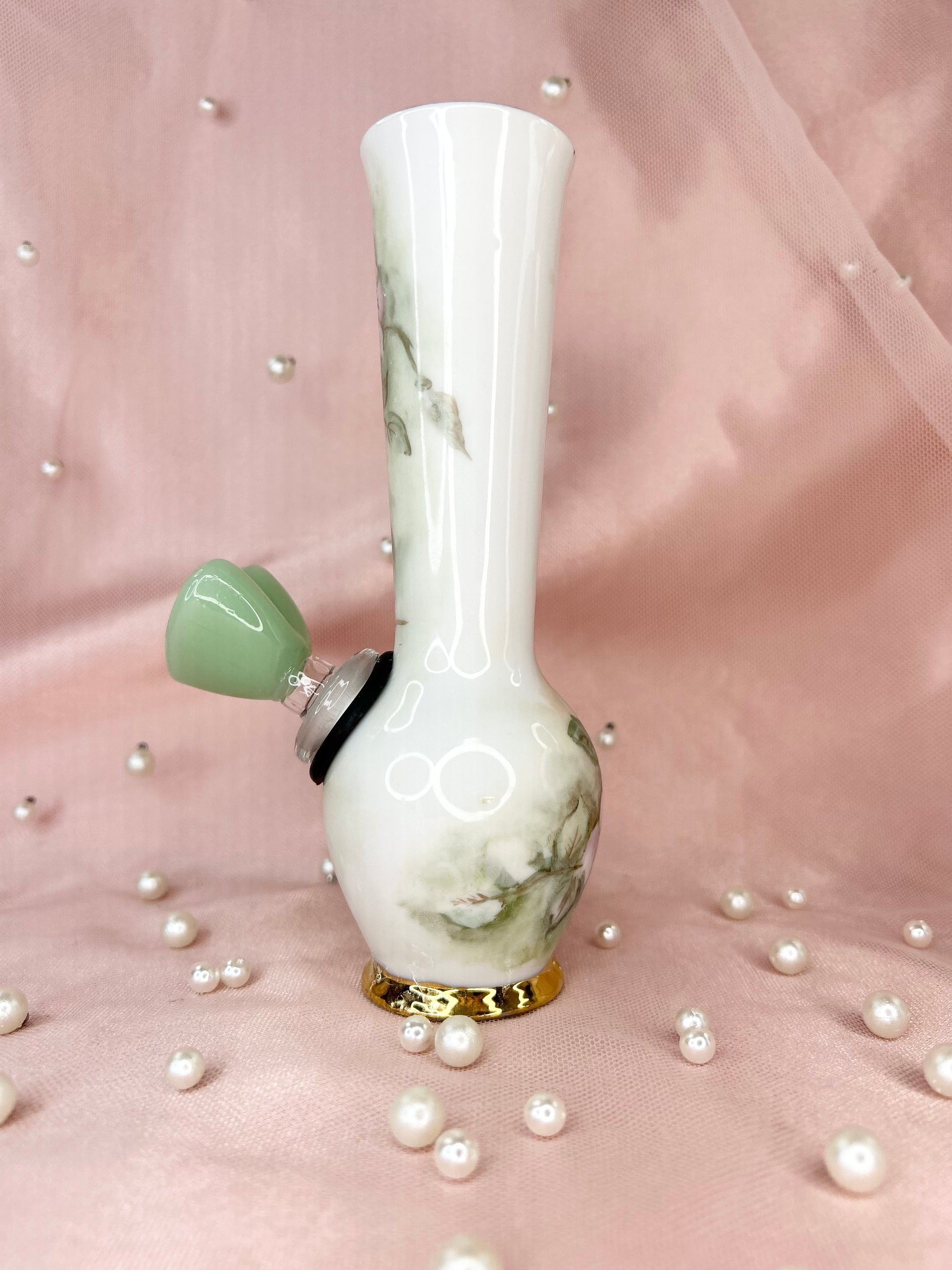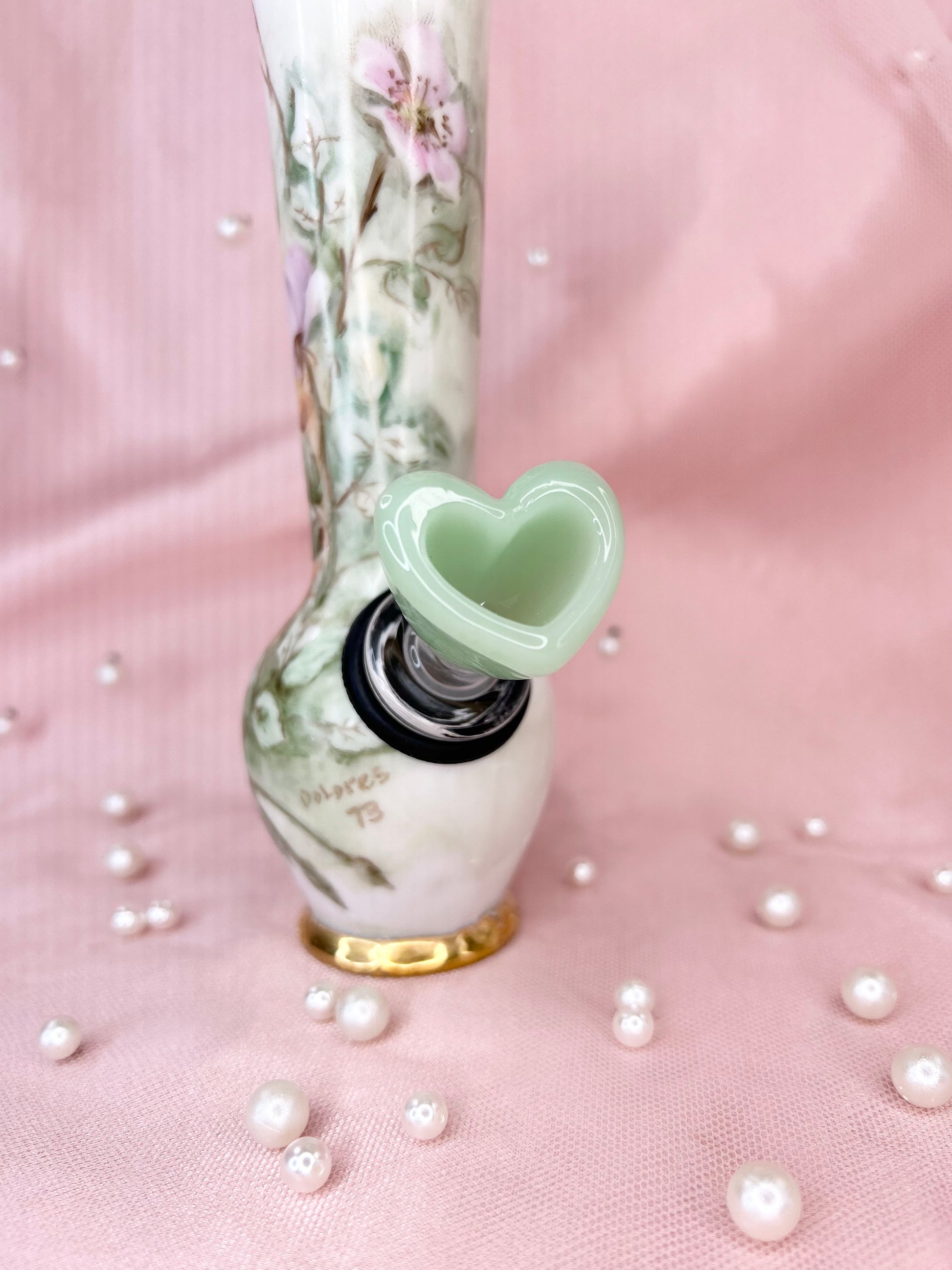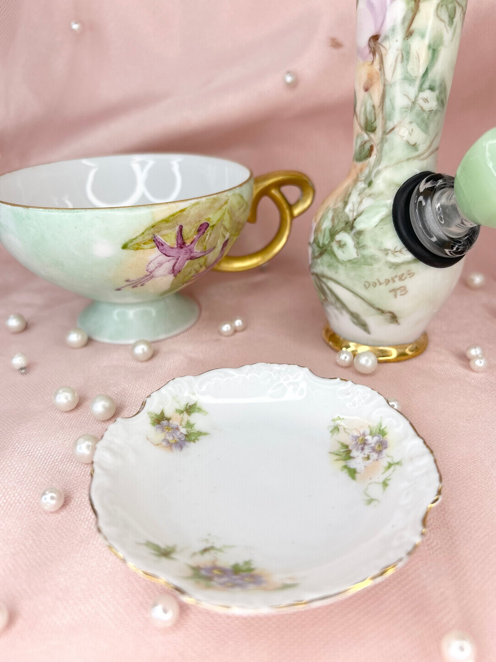 - Includes pipe, 14mm green heart glass bowl piece, ashtray and floral tea cup
