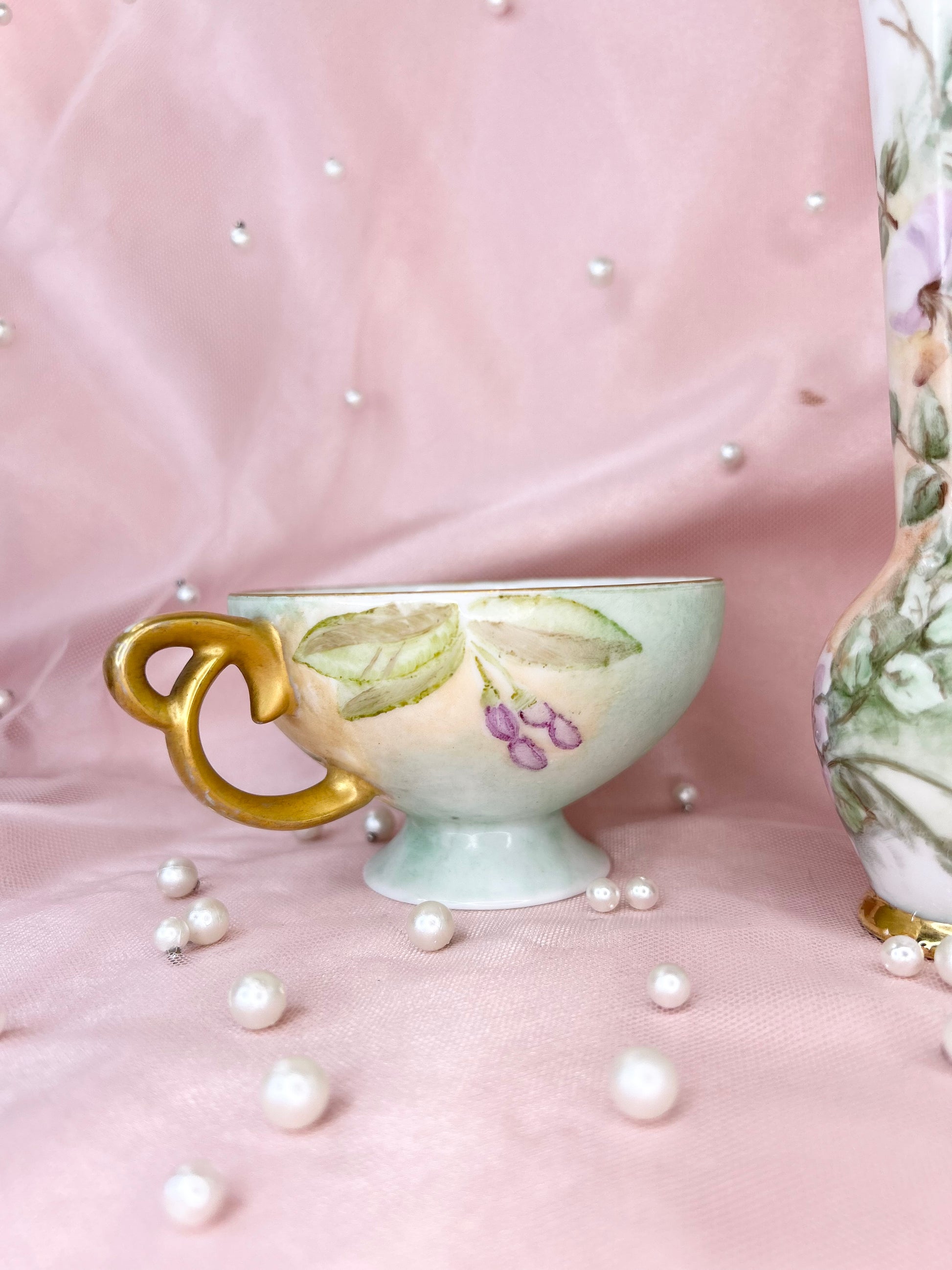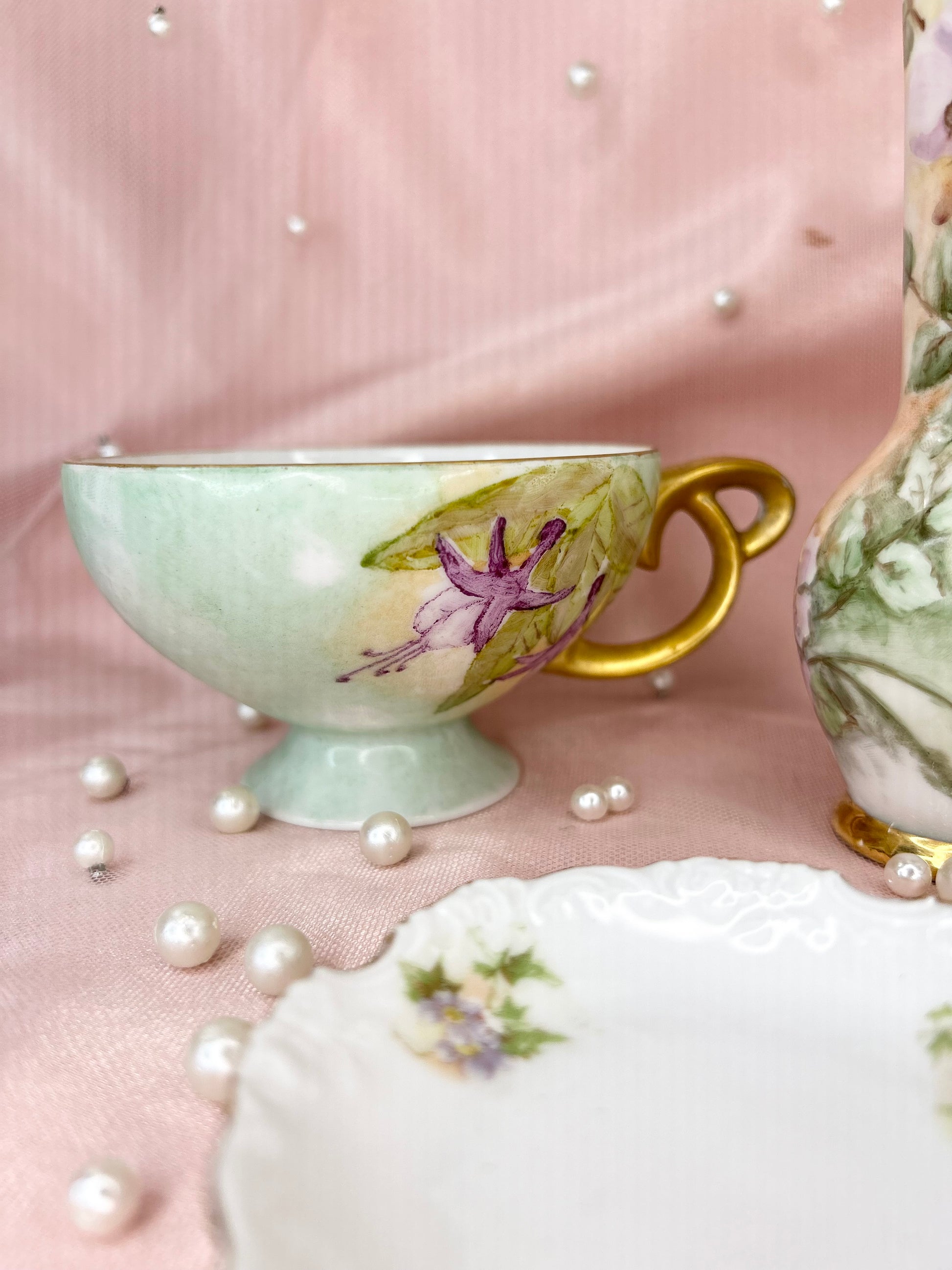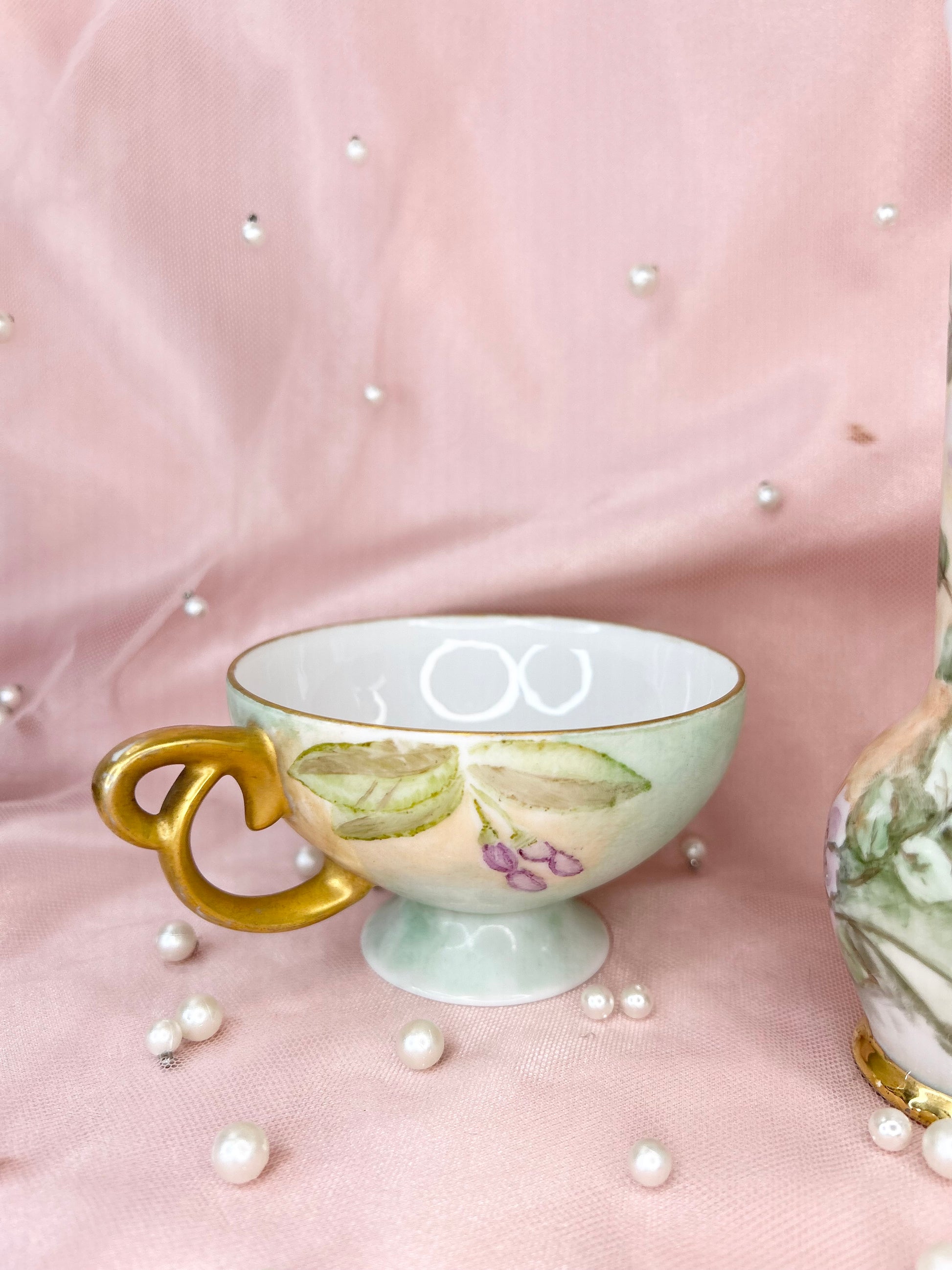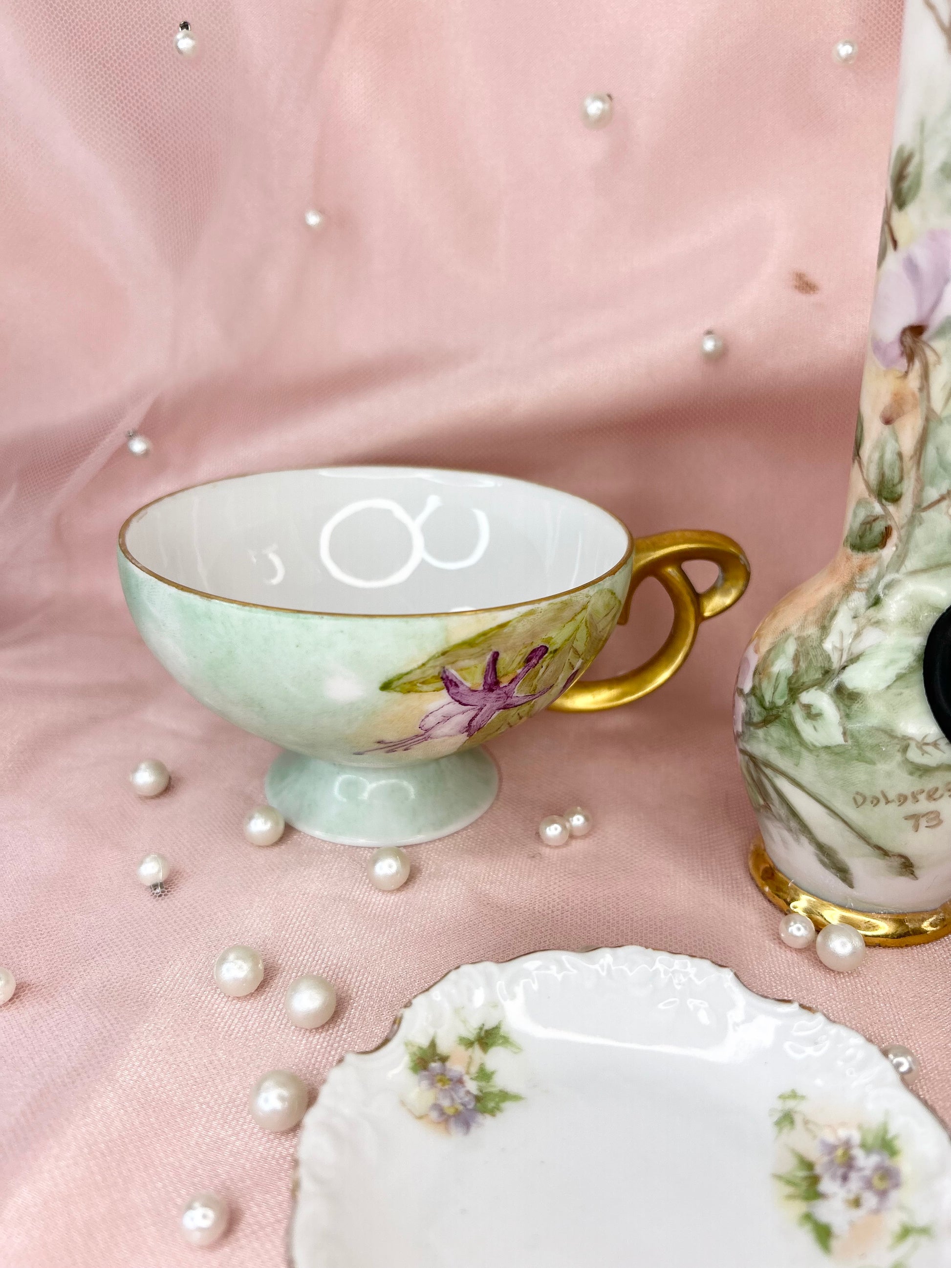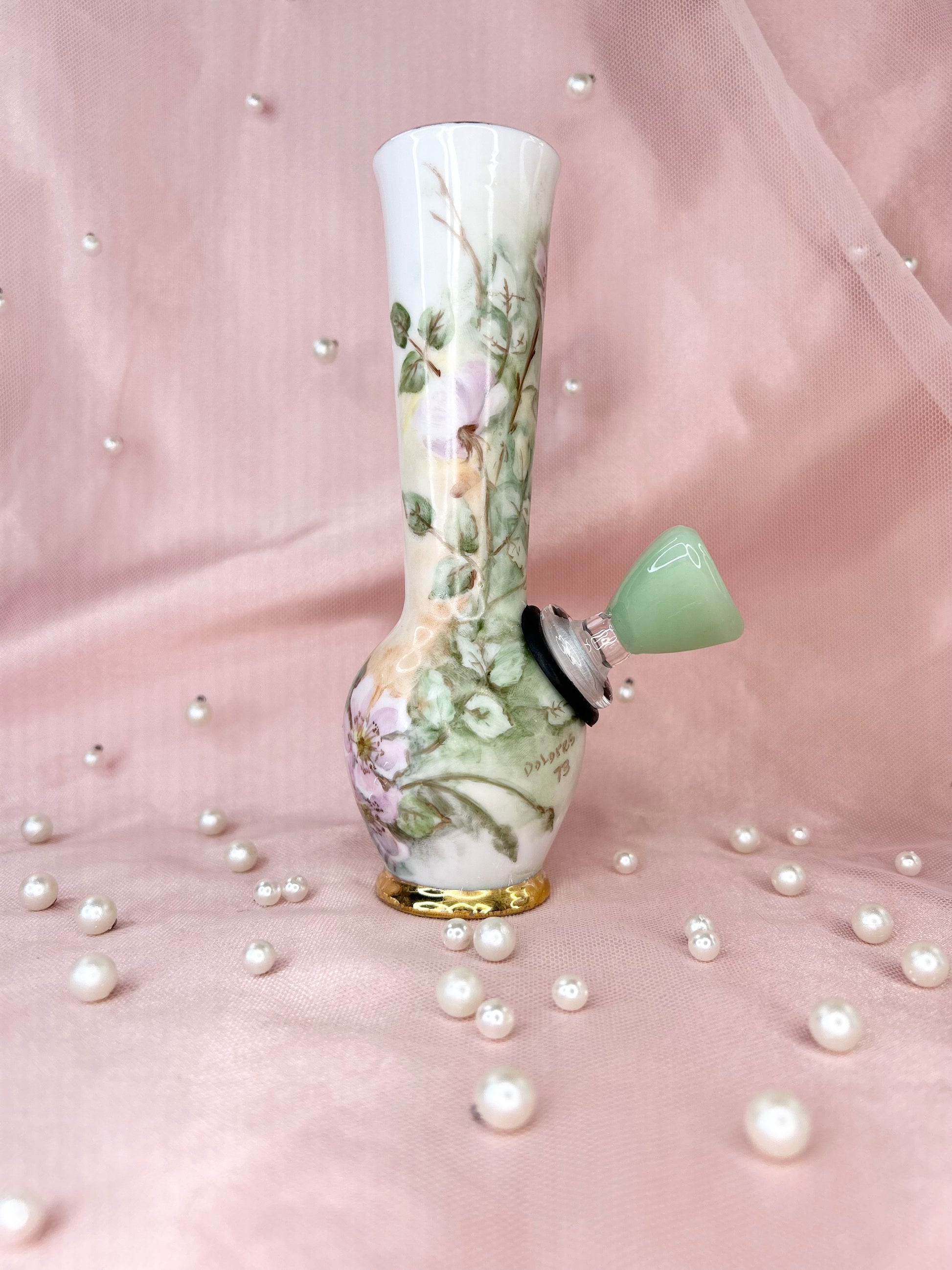 - Includes pipe, 14mm green heart glass bowl piece, ashtray and floral tea cup