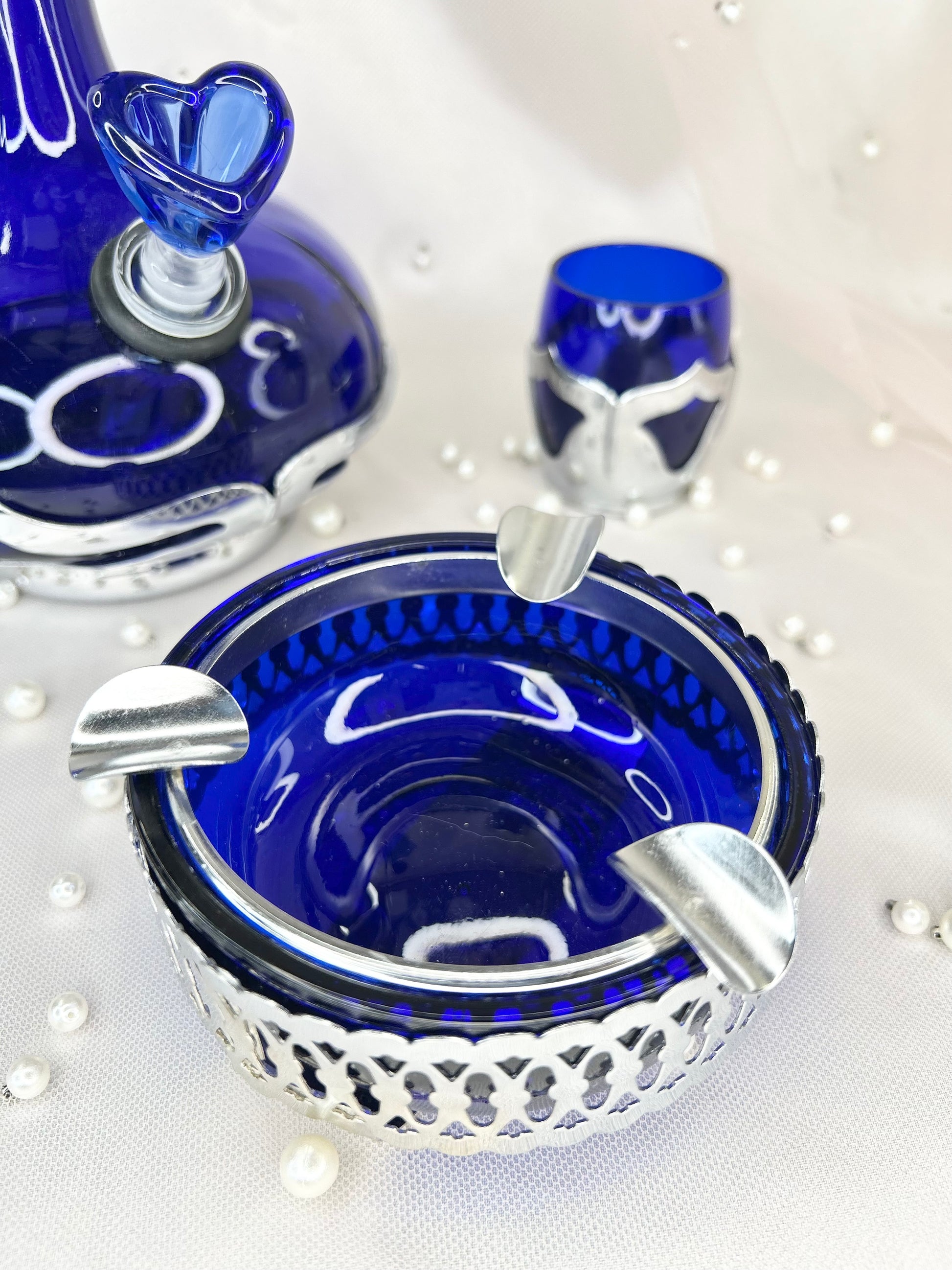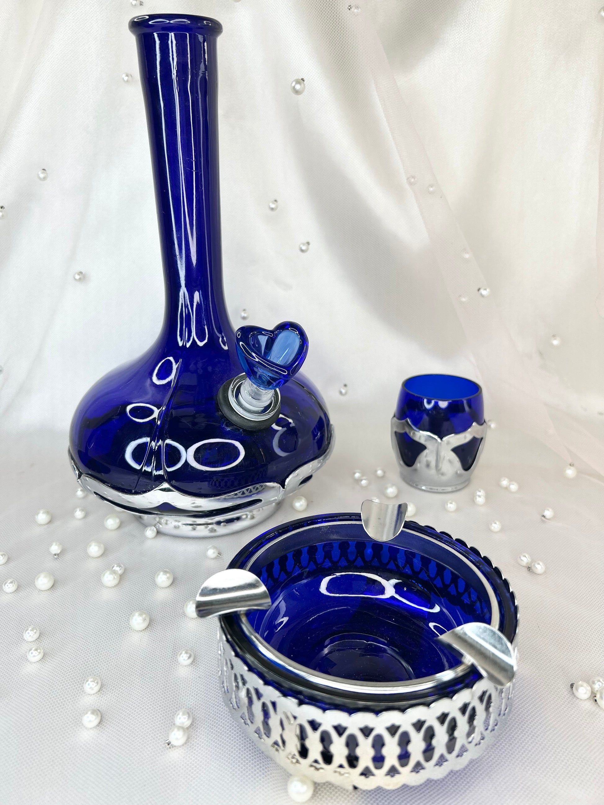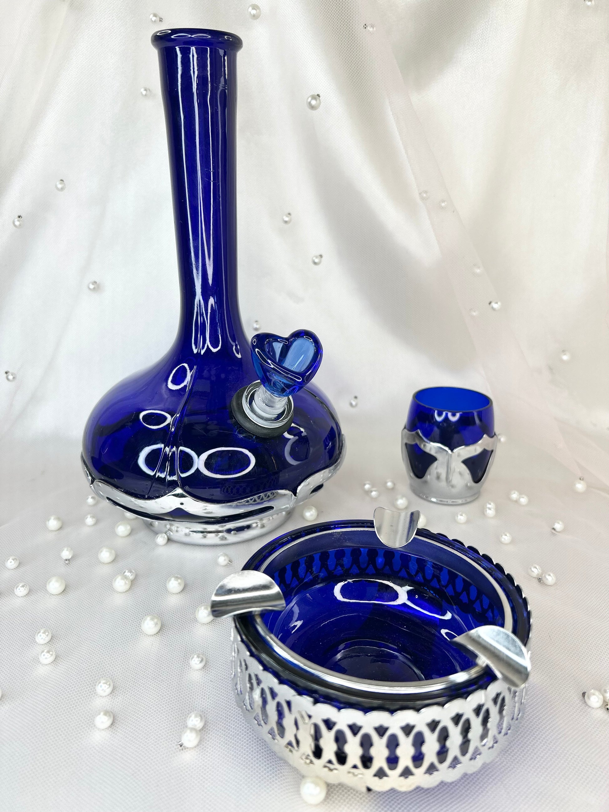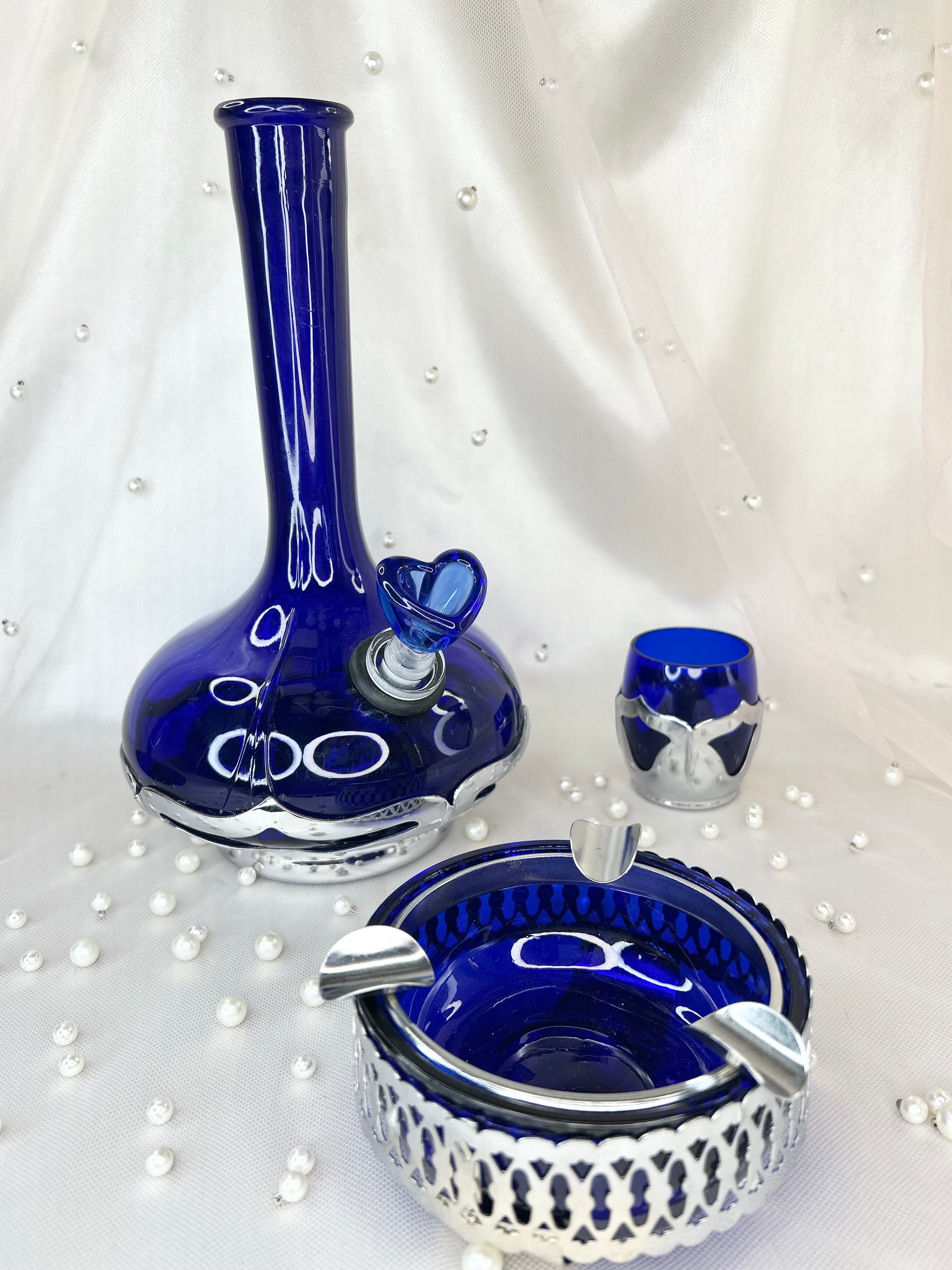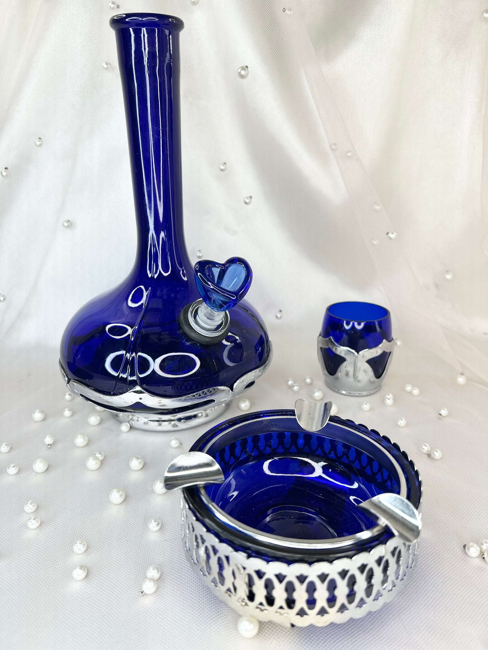 - Includes 14mm blue glass heart bowl, ashtray and small matching glass