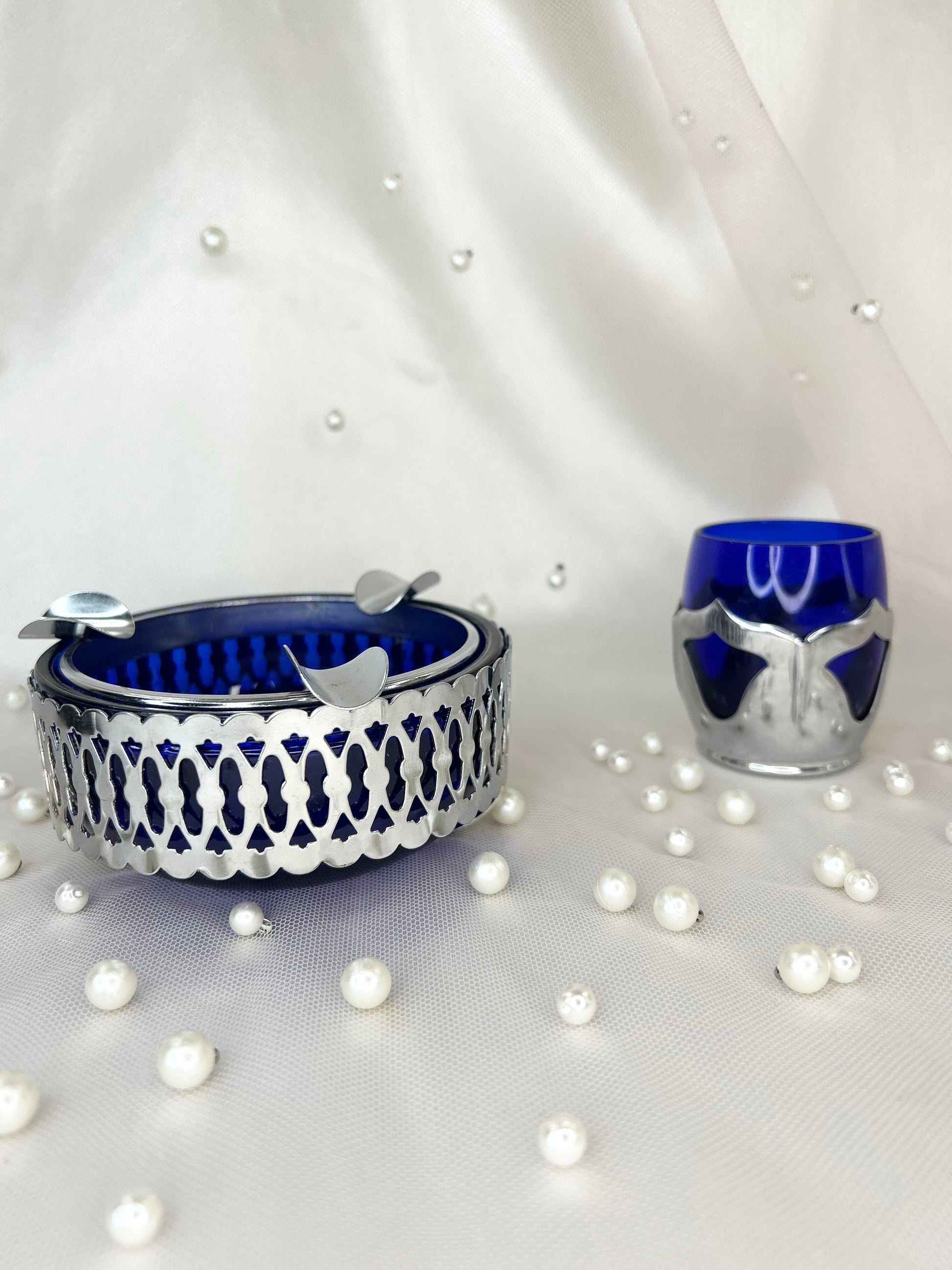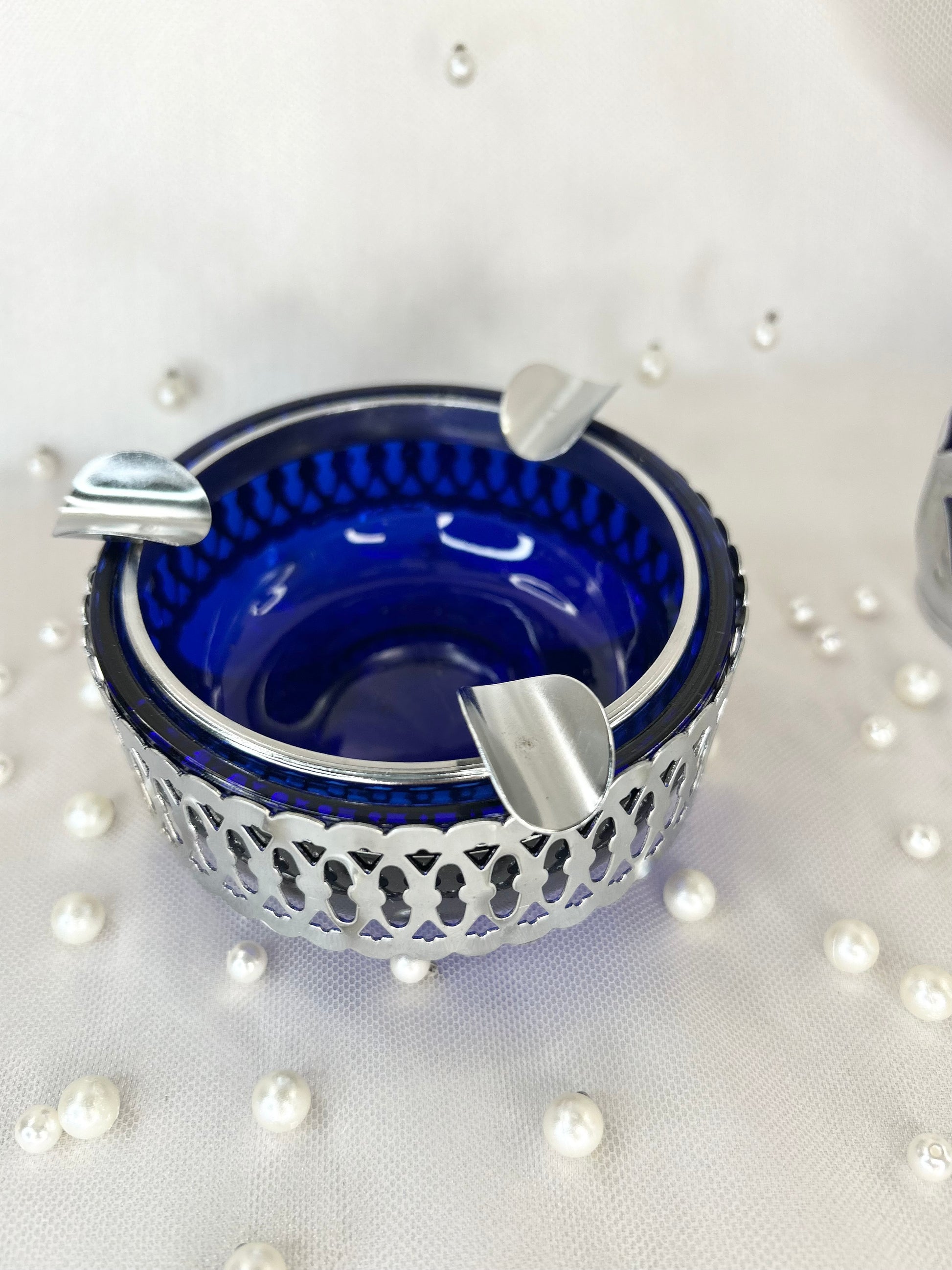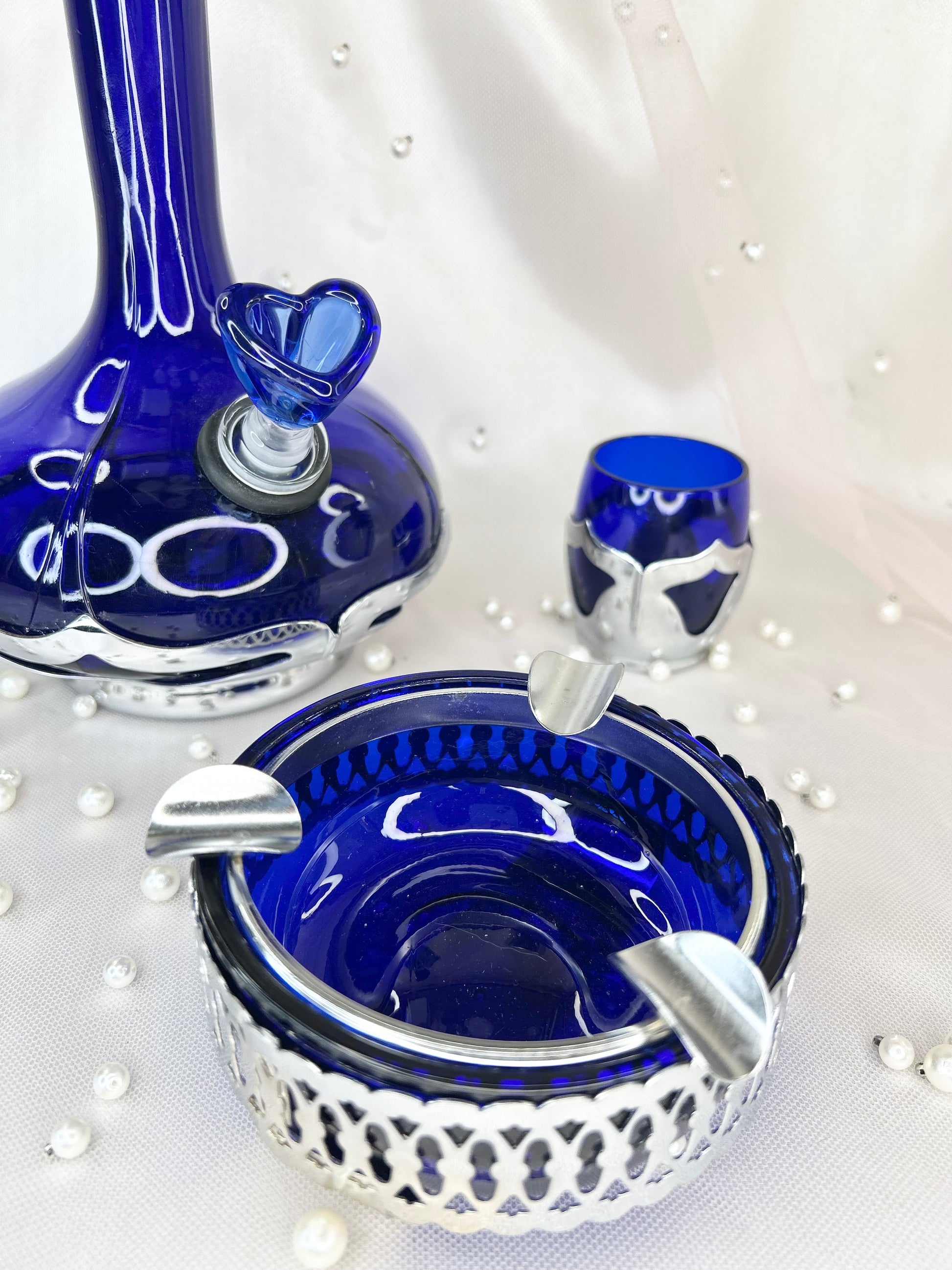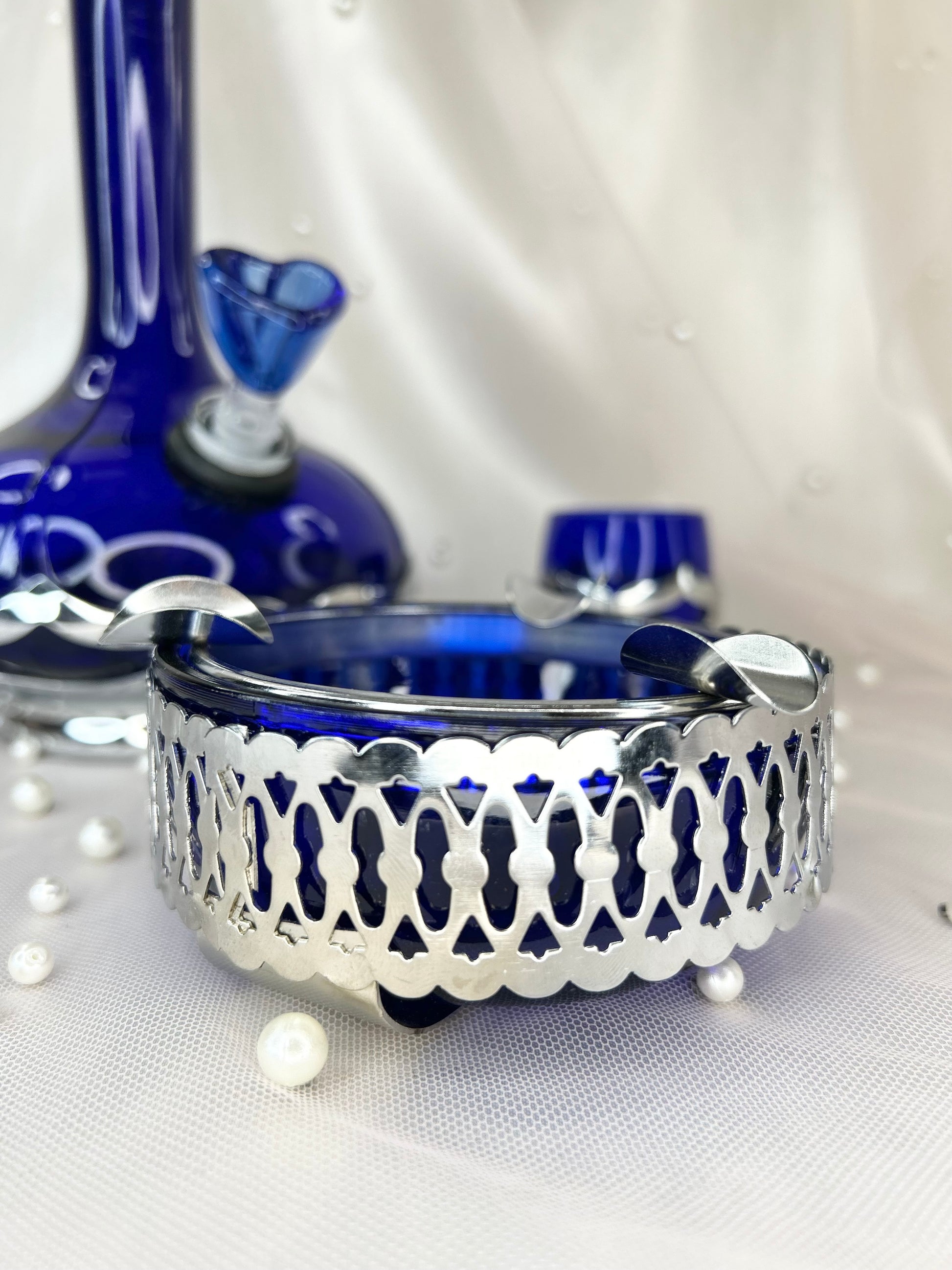 - Includes 14mm blue glass heart bowl, ashtray and small matching glass